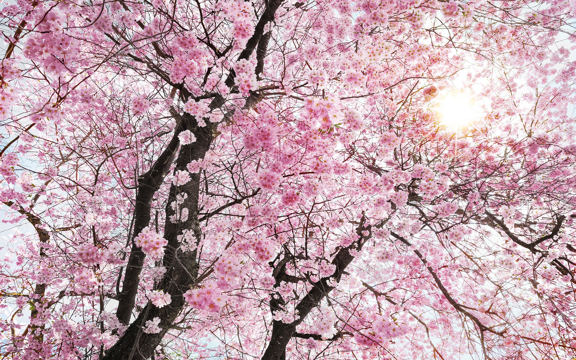 Spring is in the air! The first warm rays of the sun shine through a mass of delicate pink blossoms.