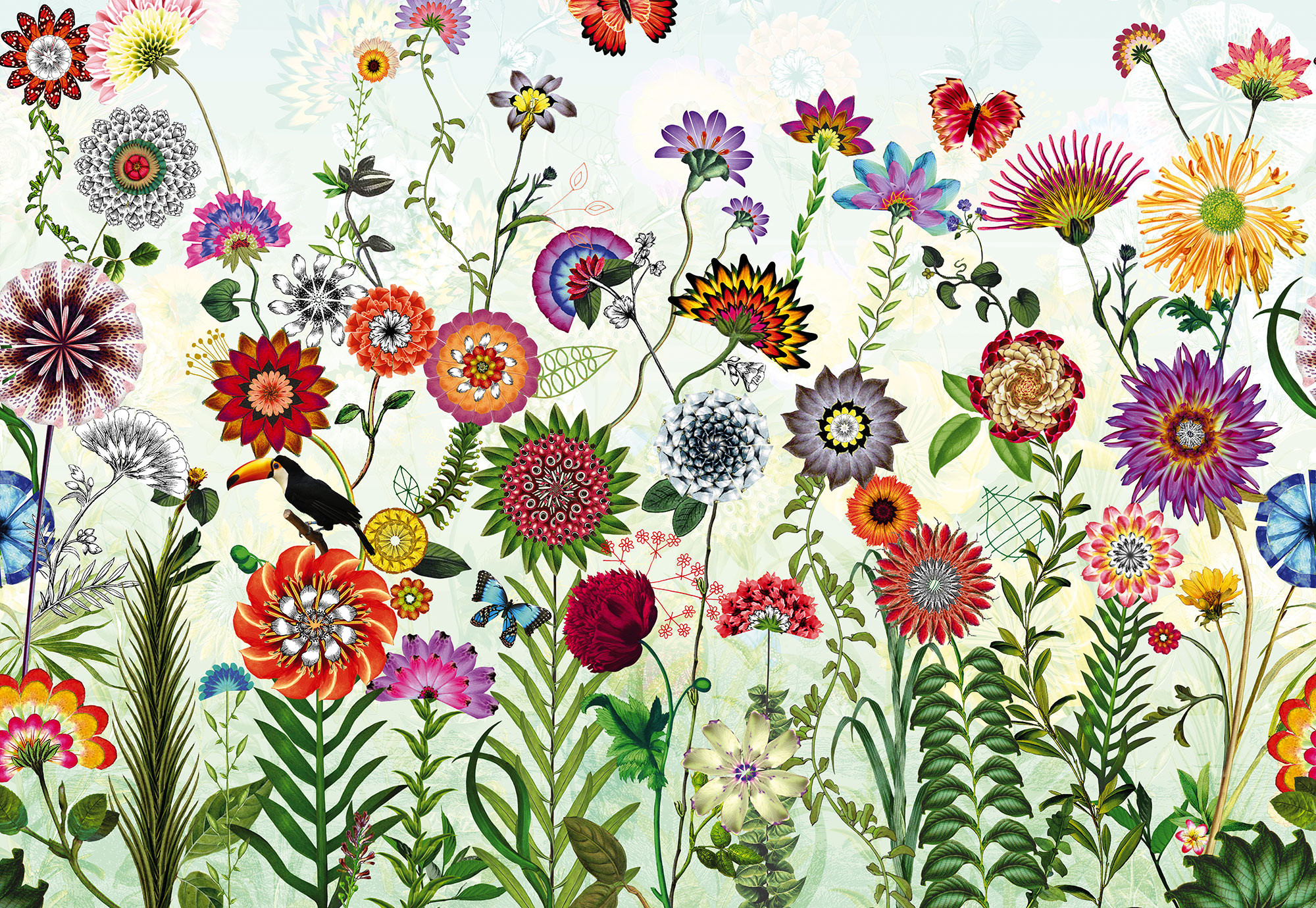 The flowers and blossoms of this 3D photomural manage to bring colours and happiness at home – and reveal on closer inspection their geometrical structure.