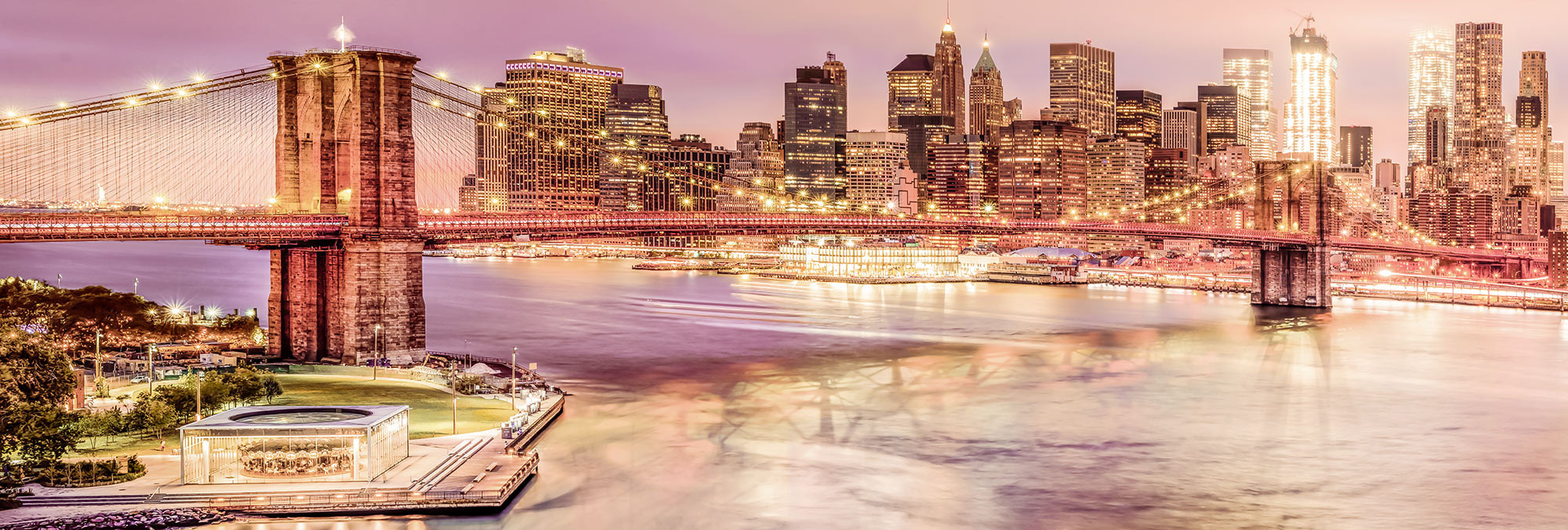 The light of dusk creates a unique atmosphere and makes the Brooklyn Bridge shine. The reflections in the East River lend the scenery a dreamy touch.