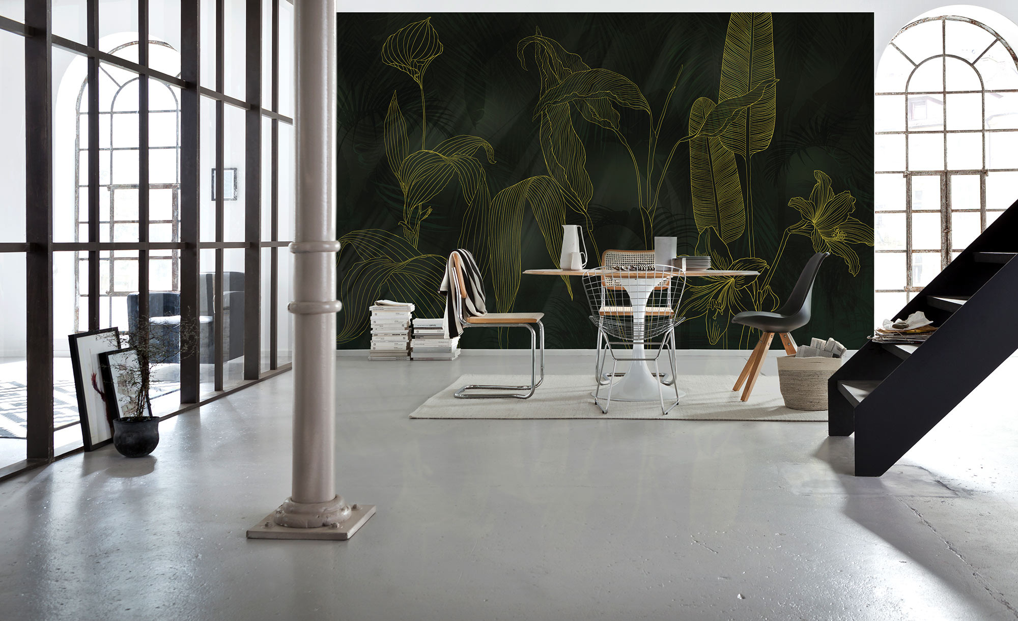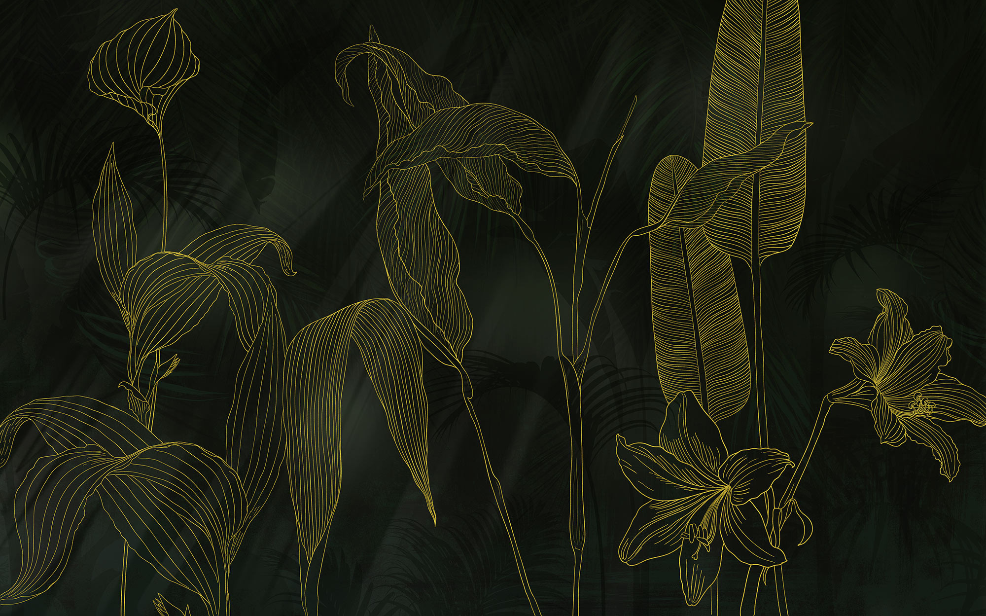 The combination of dark green and gold exudes an incredibly elegant charm. The lilies in contemporary line art skilfully underline the stylish motif.