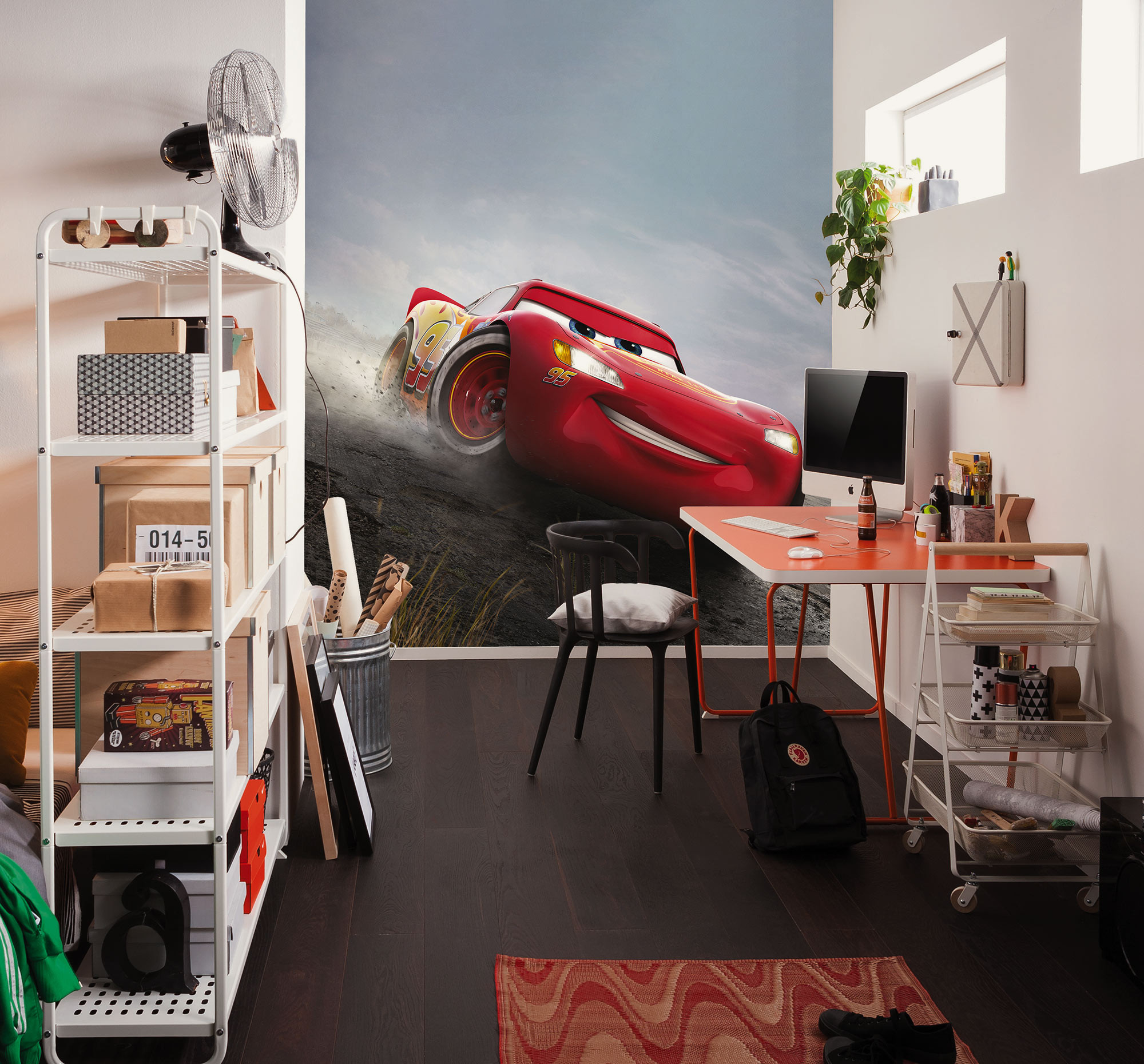 When Lightning McQueen starts a race, he really gives it his all. The vibrant photo wallpaper from Disney-Pixar's Cars features bold red and gray tones and makes for an energetic children's room.