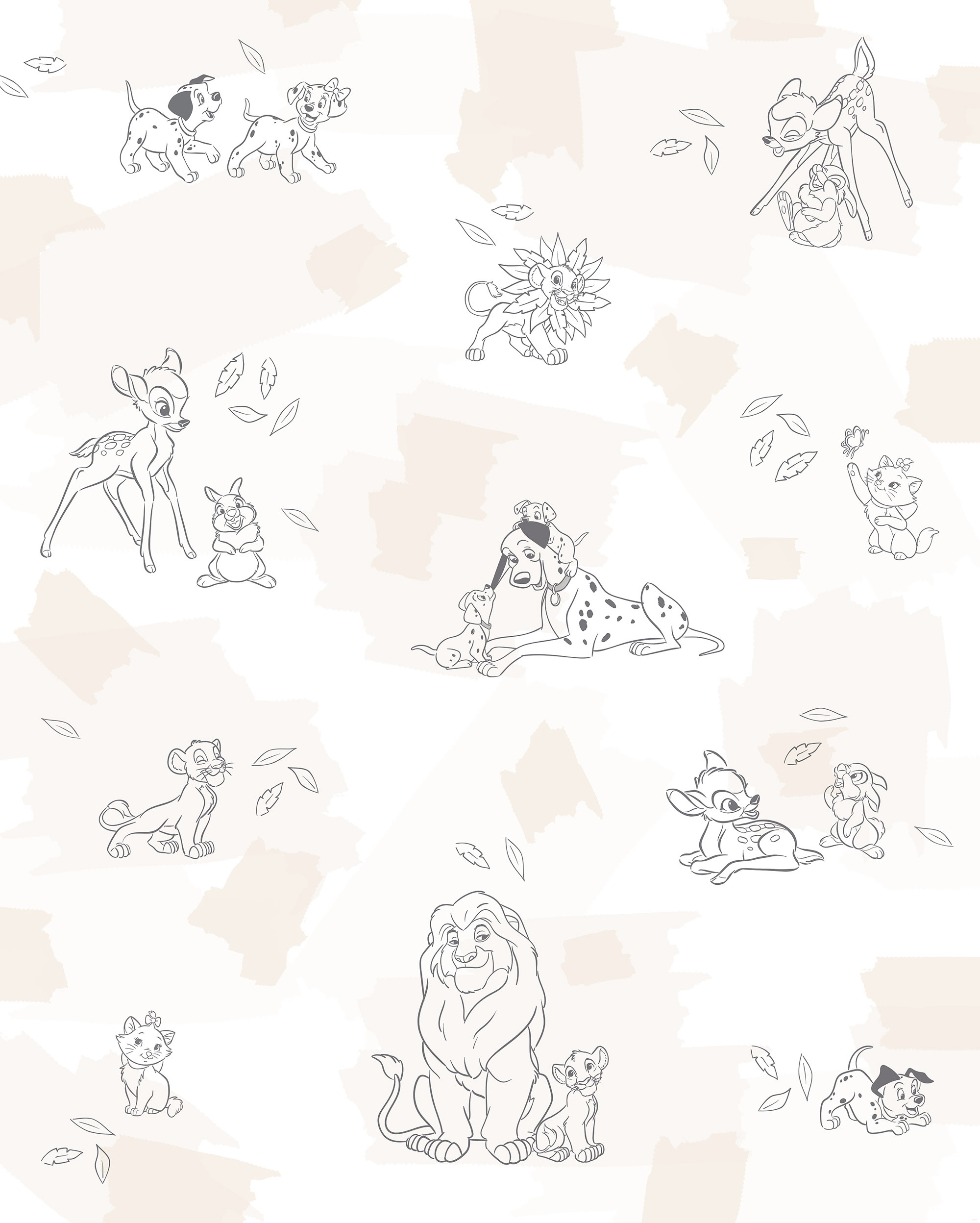 The cutest animals from Walt Disney's enchanting stories come together here! This enchanting children's wallpaper presents a variety of the most popular characters, lovingly designed in a delicate and filigree illustration style. A harmonious design that will transform any child's room into a world full of magic and adventure.