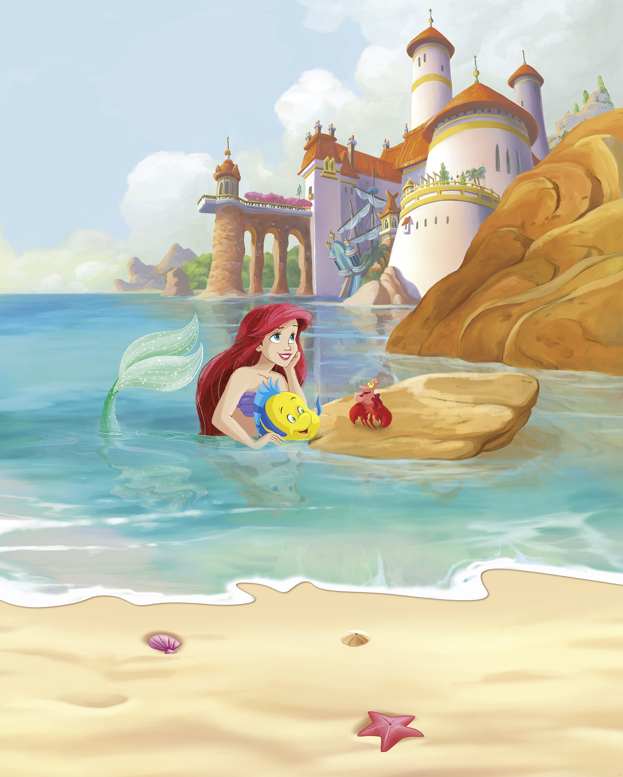 I wonder what Arielle is dreaming about right now? She gazes pensively at the coast and enjoys her place in the sun. The bold colours and the turquoise blue sea create beautiful contrasts on the wall. A fairytale Disney wallpaper that invites you to dream.