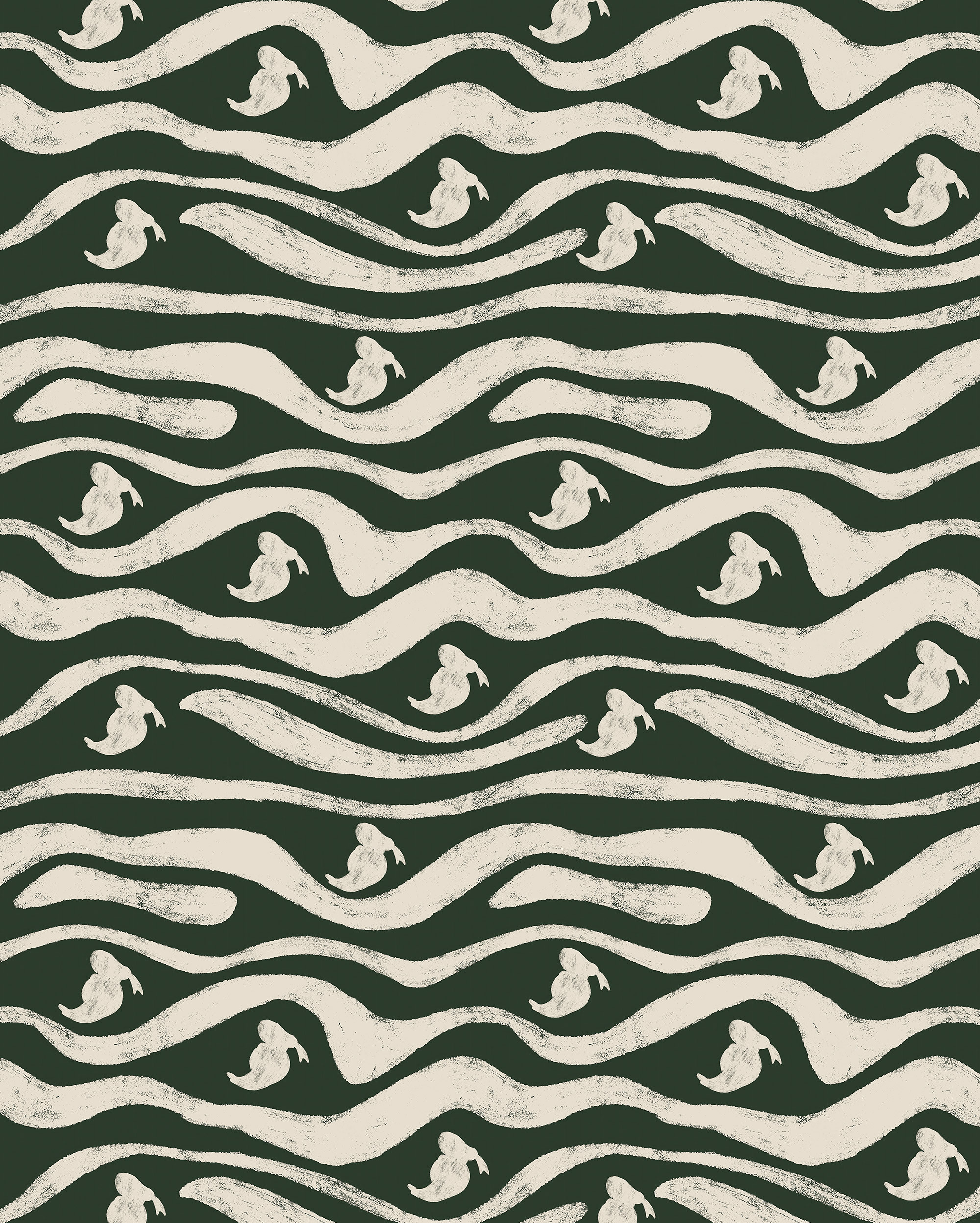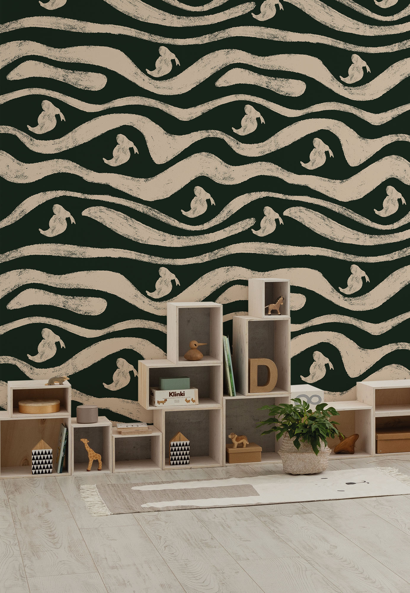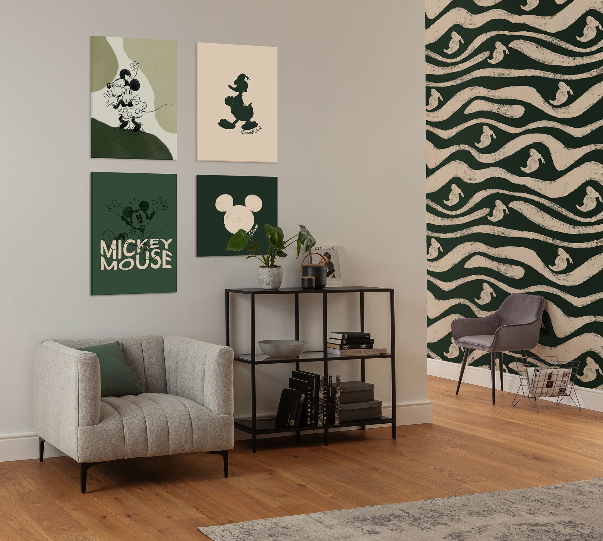 The wavy pattern is a combination of dark fir green and muted beige. The silhouettes of Donald Duck are dimly hidden in between. A stylish wallpaper with retro charm that subtly showcases the famous comic figure.