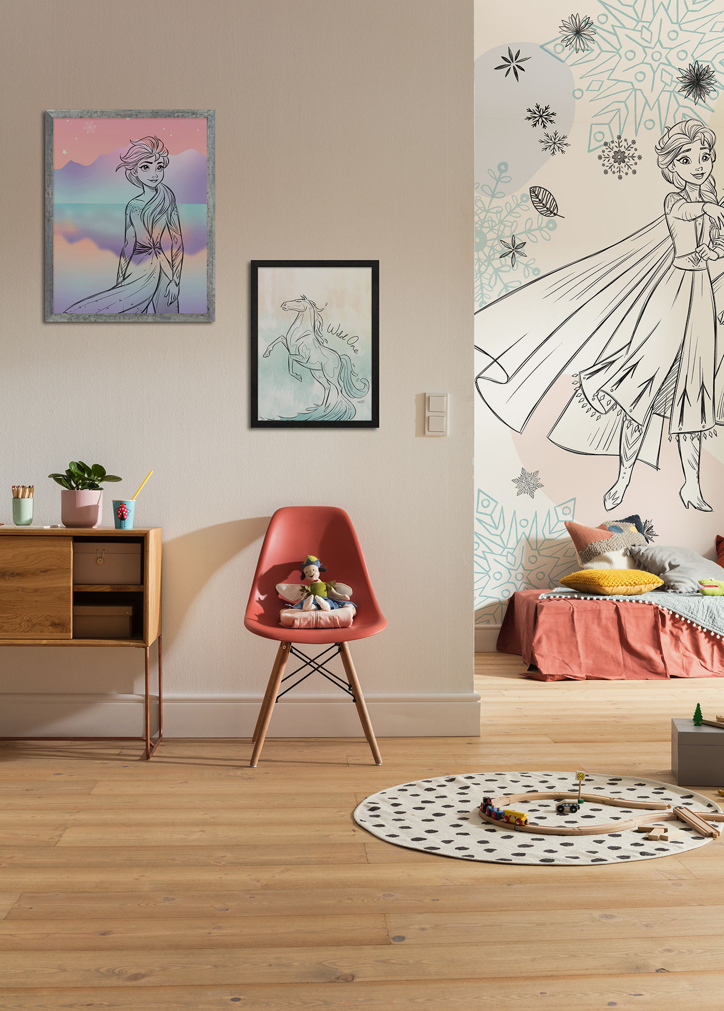 The sketchy illustrations on the wallpaper transform the four walls into the magical world of Arendelle. With Elsa, Anna and Olaf in tow, fairytale accents are set in the children's room. Delicate leaves and snowflakes emphasise the natural and playful look of the photo wallpaper.