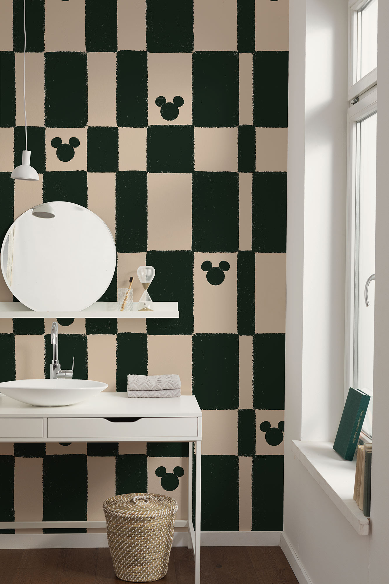 Ingeniously concealed yet unmistakable: the iconic Mickey Mouse head has been skilfully integrated into a chessboard-like pattern. The two-colour design gives the wallcovering a playful lightness and is a stylish highlight for all mouse fans who want to express their passion for collecting with elegance. The motif is suitable for children's rooms as well as for the rooms of trend-conscious teenagers who want to present a special highlight in their retreat.