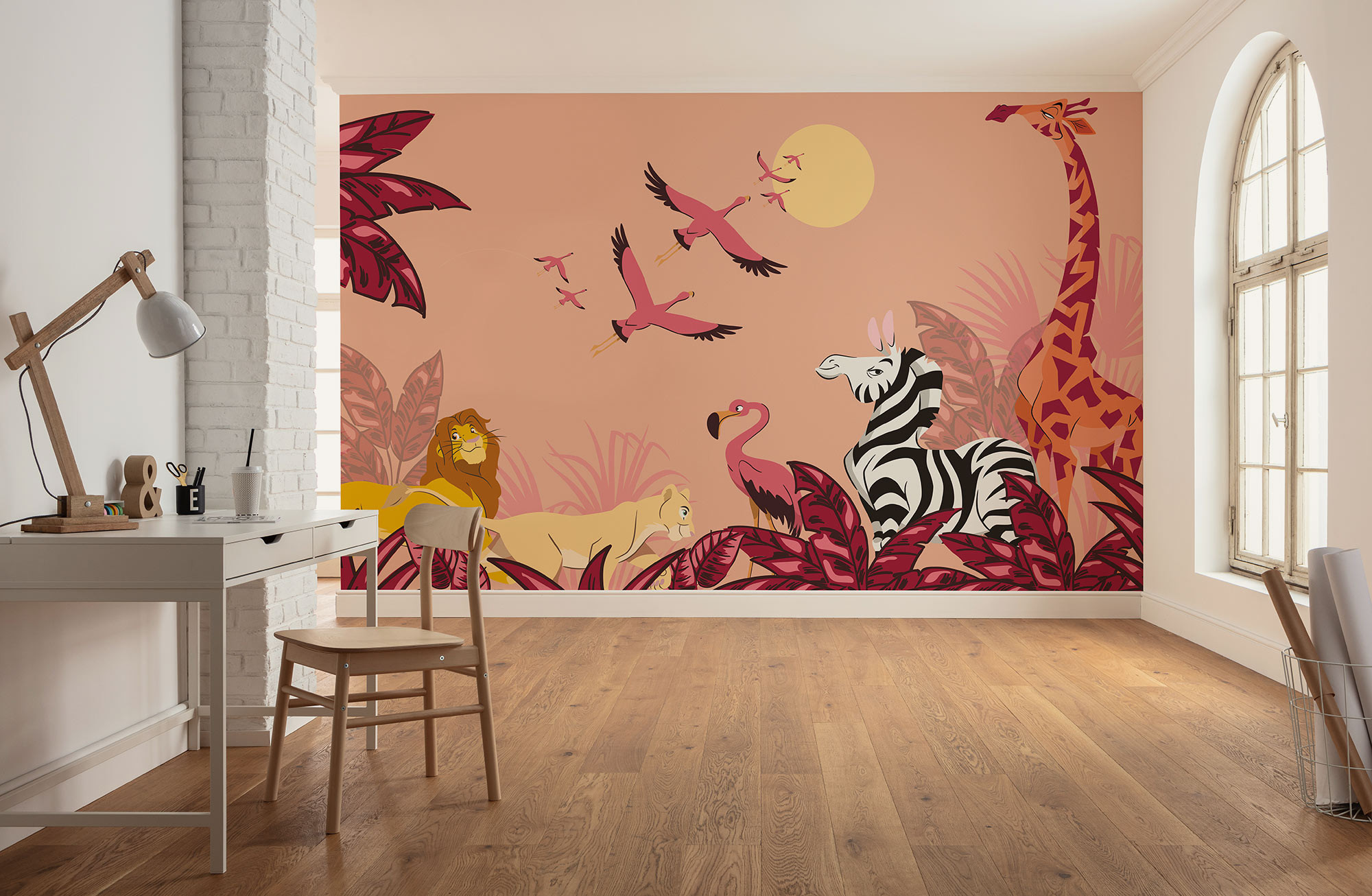On his adventurous foray at sunset, Mufasa is accompanied by old friends. The giraffe stretches its neck upwards and the flamingos chatter happily to themselves. They are all bathed in the fiery red of the setting sun - a wonderful moment of harmony.