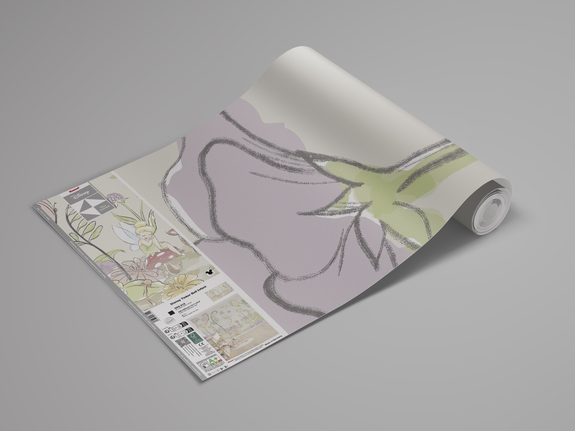 This enchanting photo wallpaper shows Tinker Bell, surrounded by a colorful floral landscape and lovingly designed details such as butterflies and mushrooms. The delicate pastel tones and imaginative scenery create a fairytale atmosphere that invites you to dream.