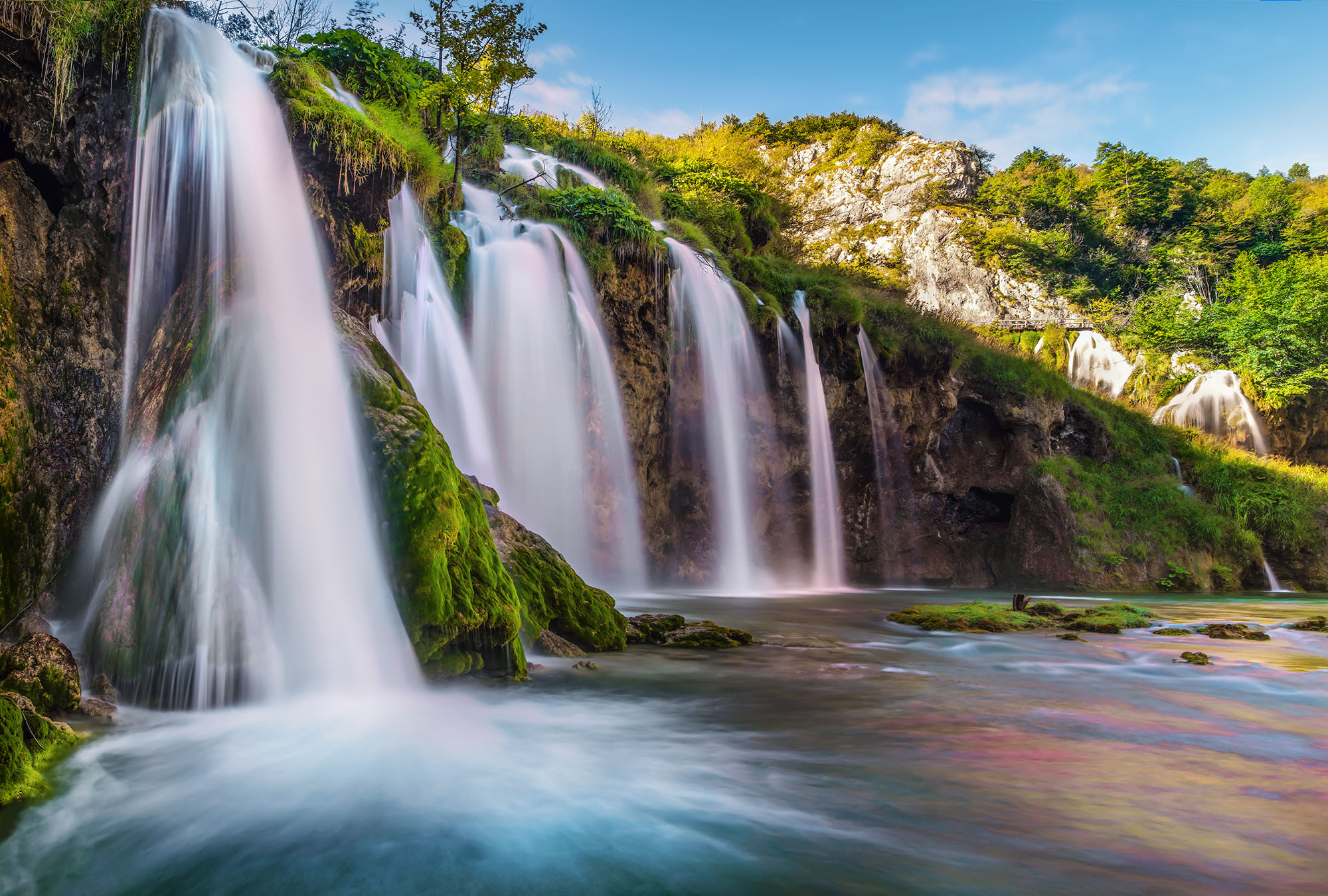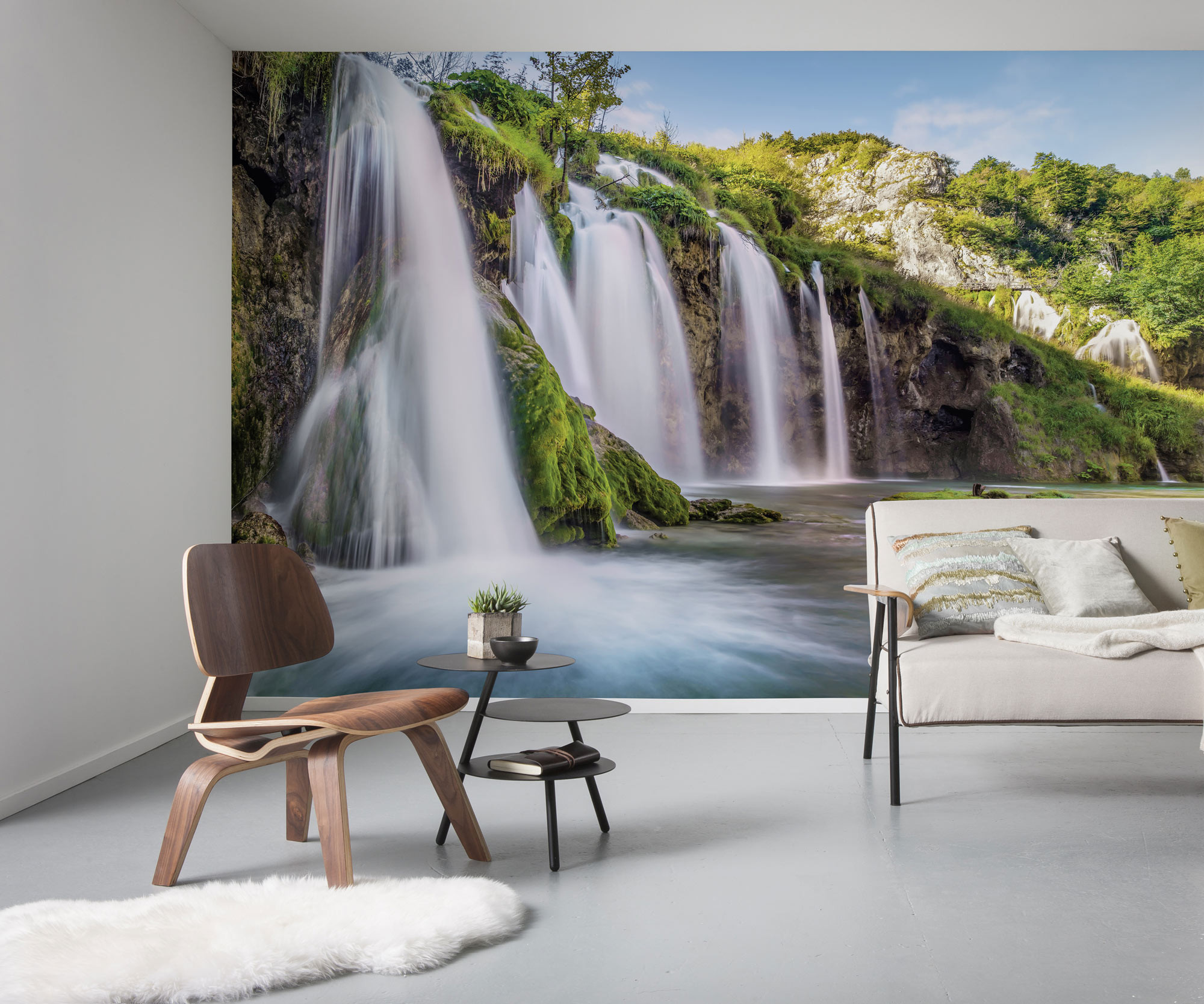 An impressive display of natural beauty: the dynamic waterfalls, embedded in a lush, green rocky landscape, lend the room an extraordinary ambience.