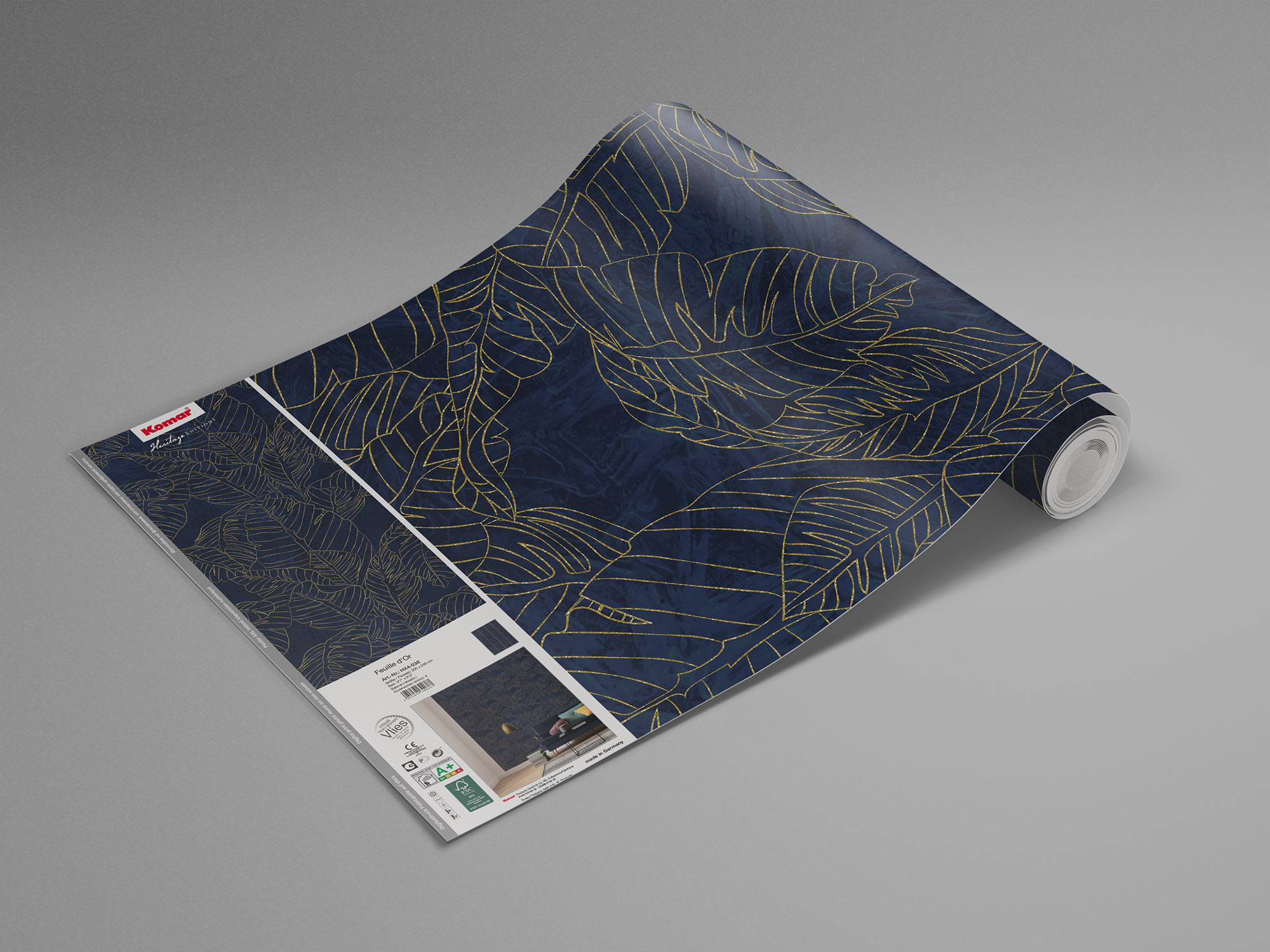 Leaves intertwine in fine golden lines against a midnight blue background.