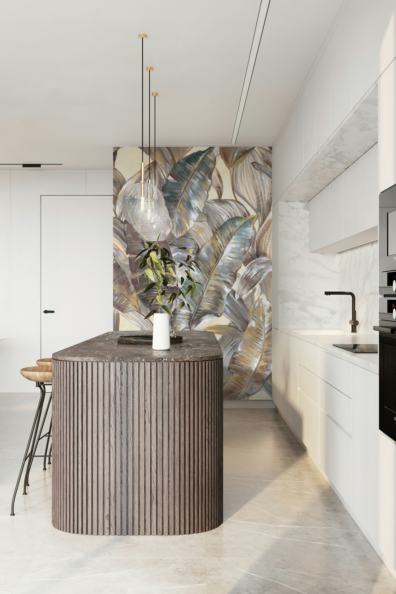 With its design and structure, the golden foliage radiates modernity and glamour at the same time. The mural brings luxury into the home without being ostentatious.