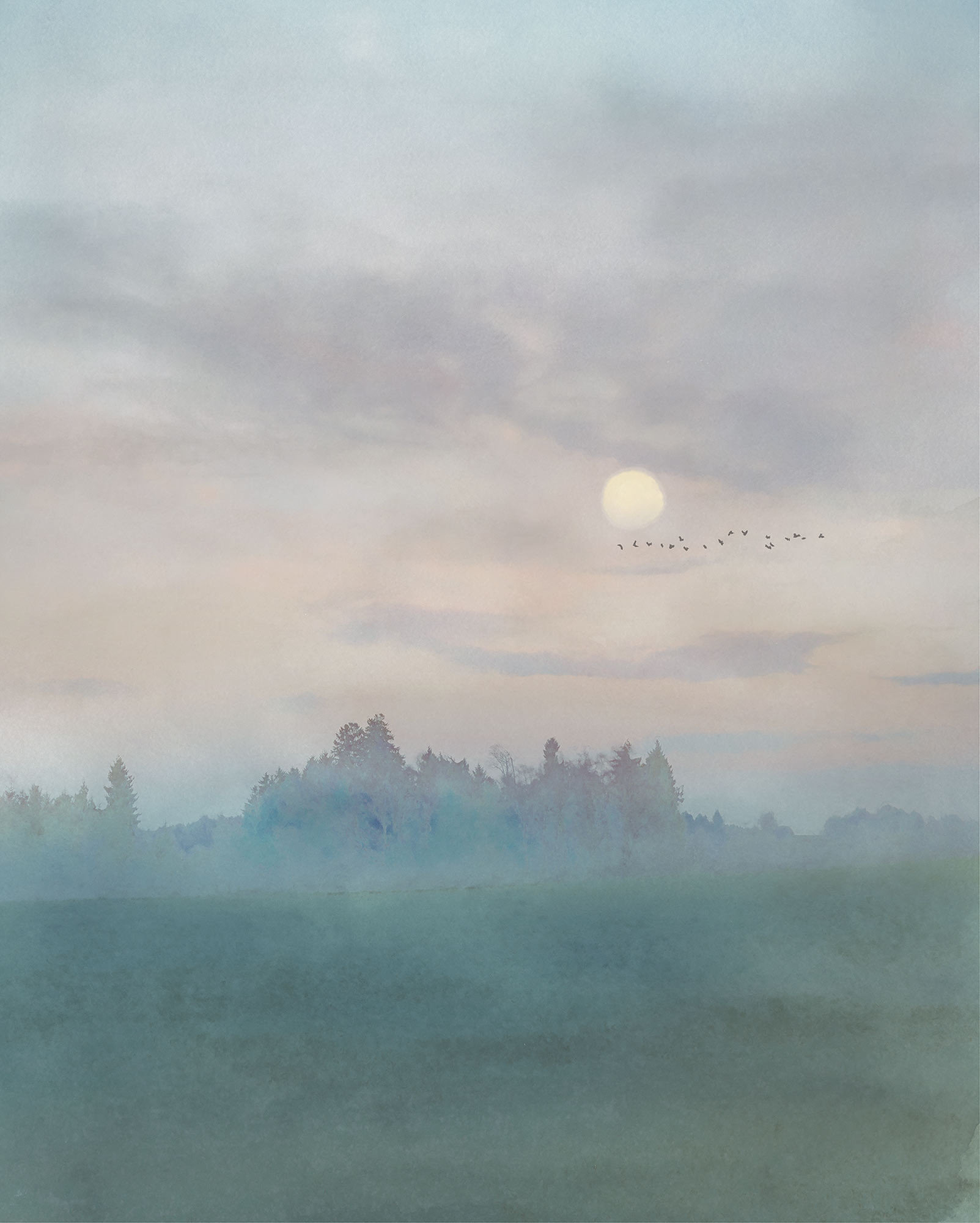 The edge of the forest appears almost mystical through the blanket of mist. The colours gives the landscape a soft sheen, taking the viewer into a dream world.