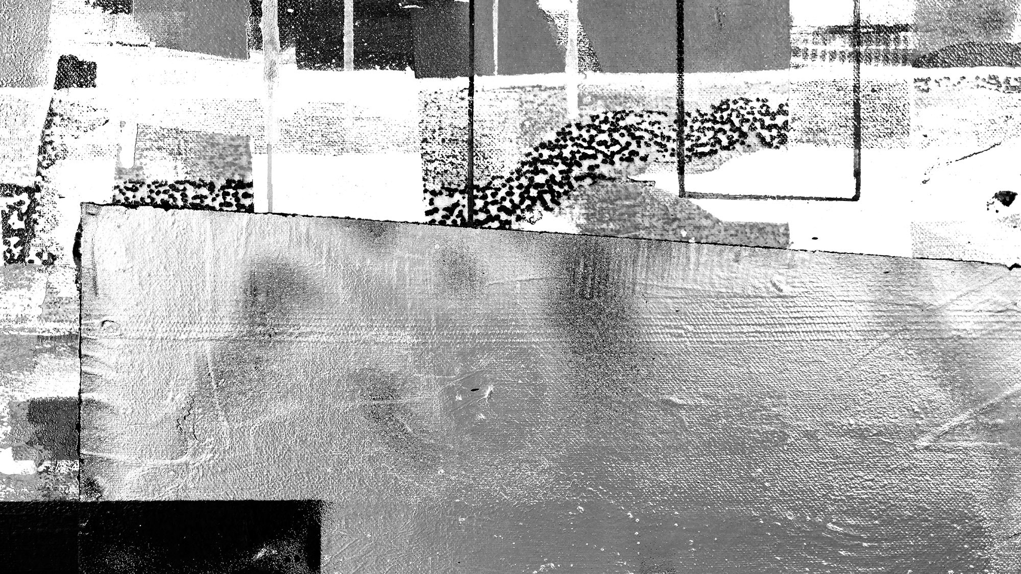Infinity Prancing: Grafische Farbbänder, eine statische Fläche und malerisch-flüssige Konturen verflechten sich zu einer aufgewühlten Landschaft in grau, weiss.