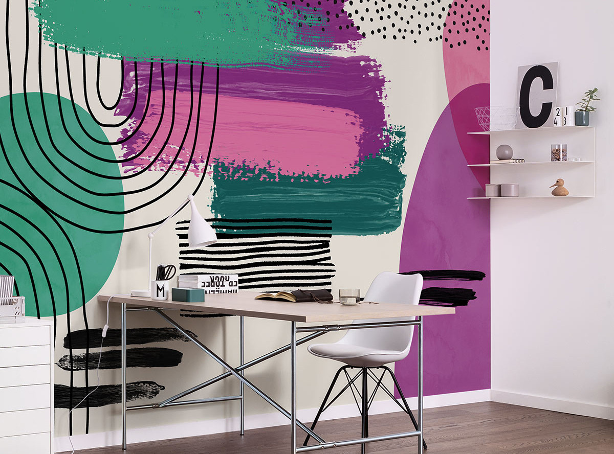 This photomural in an appealing mix of purple, pink and turquoise captures the spirit of retro design with its diverse patterns, shapes and colours and brings the characteristic retro look to any home. A real eye-catcher that is guaranteed to attract attention.