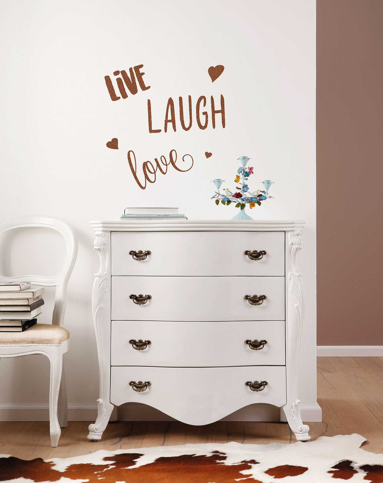 The wall tattoo with the motto „live, laugh, love“ brings positive engergy into the living room.
