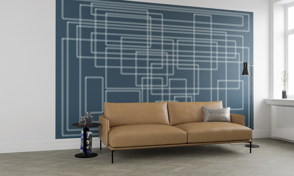 Mills Board Dashed ice-prussian: Kontrolliertes Linienchaos in blau, weiss.
