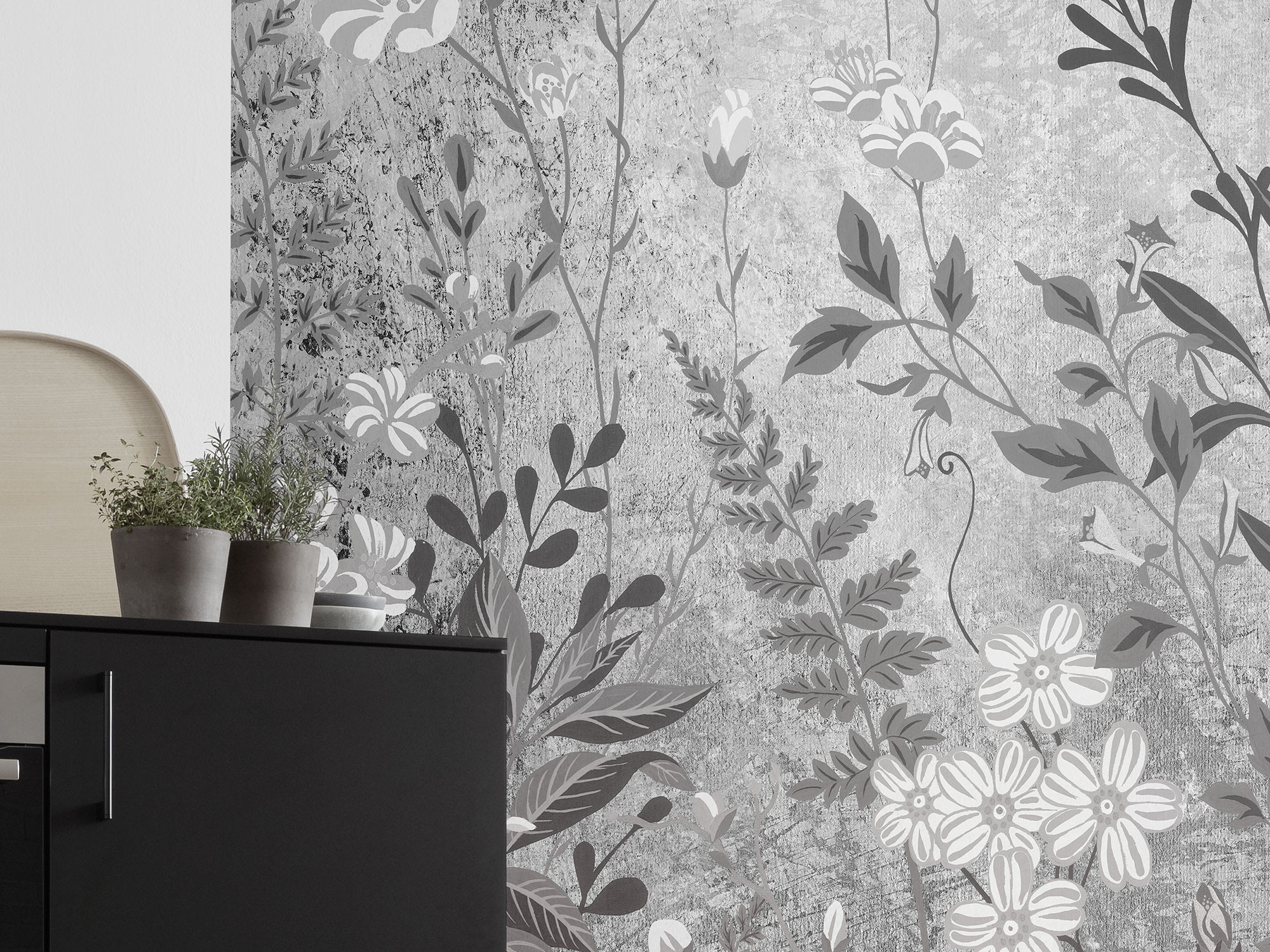 This flower meadow, located in a solitary clearing within the forest, really comes into its own in the night moonlight. However, the colour of each flower is not discernible to the eye because this floral wall adornment retains its black-and-white design.