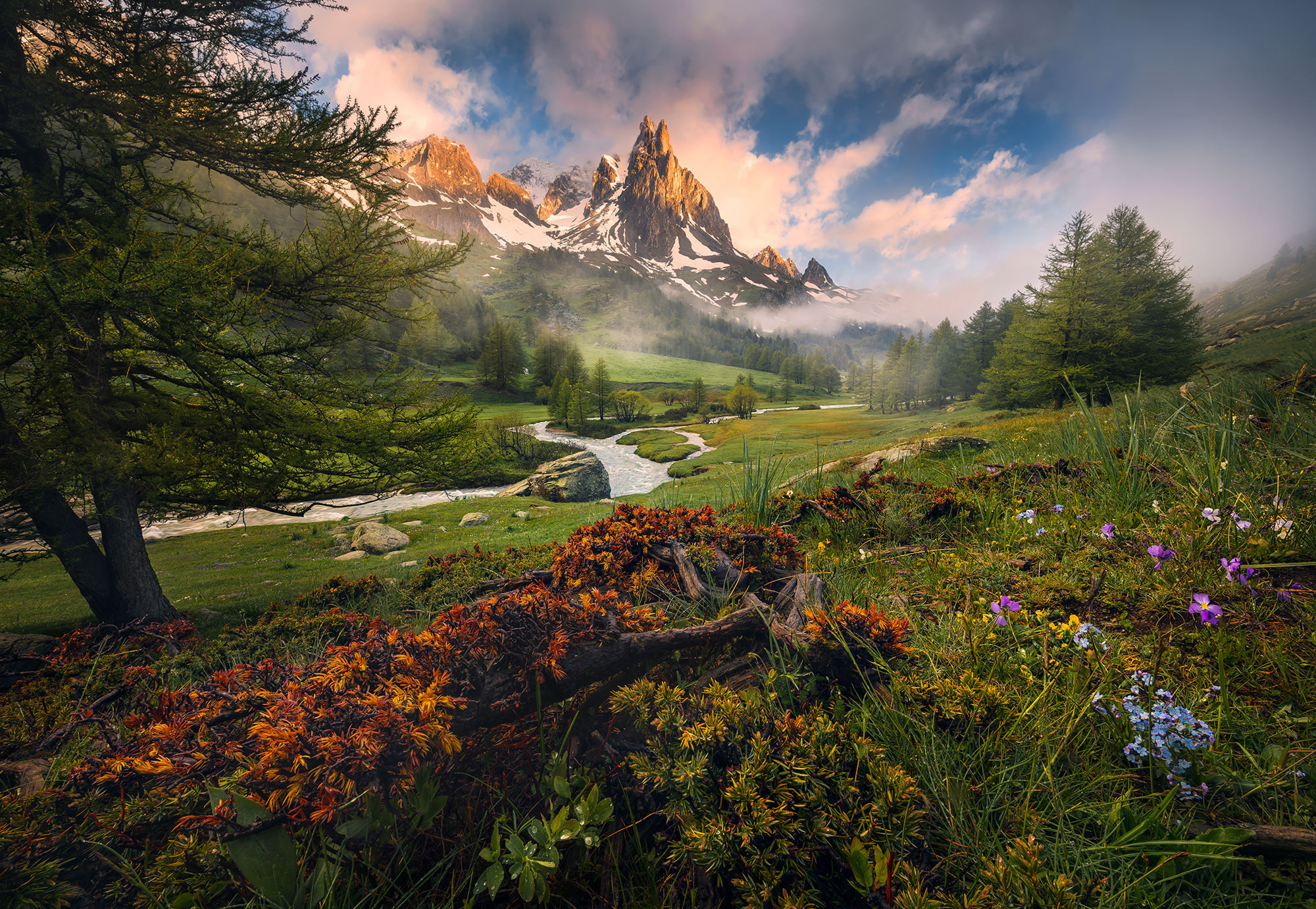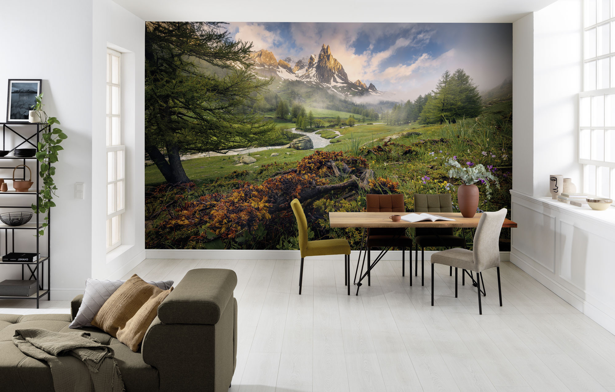 The mountains stretch imposingly over the valley as the last rays of sun illuminate the rocky massif. This exquisite photomural invites you to dream and inspires mountain lovers to conquer their next summit.