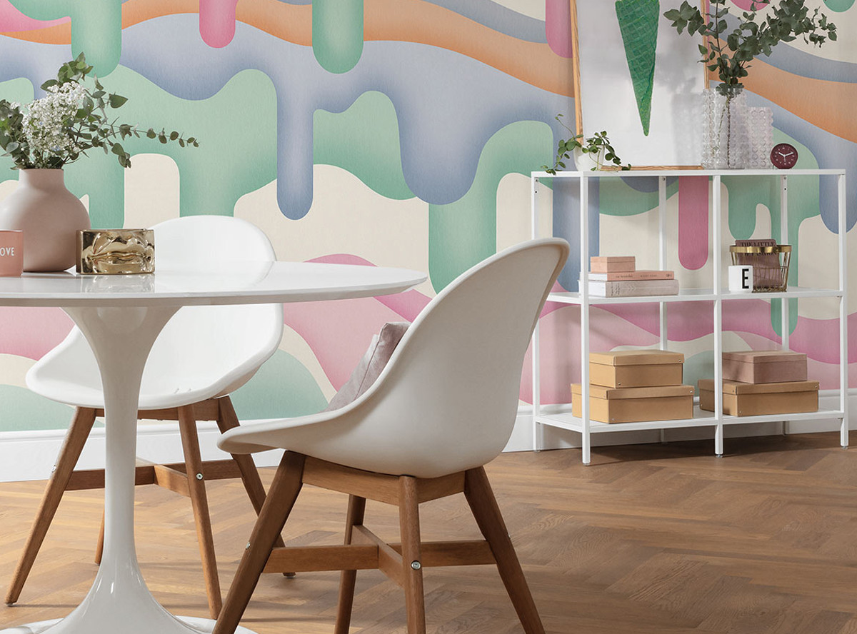 This photomural is reminiscent of melted ice cream in various pastel colours. Its cool, modern design makes it a favourite wall decoration for bold and trendy interior designers. It is in line with the current trend and also radiates a positive mood.