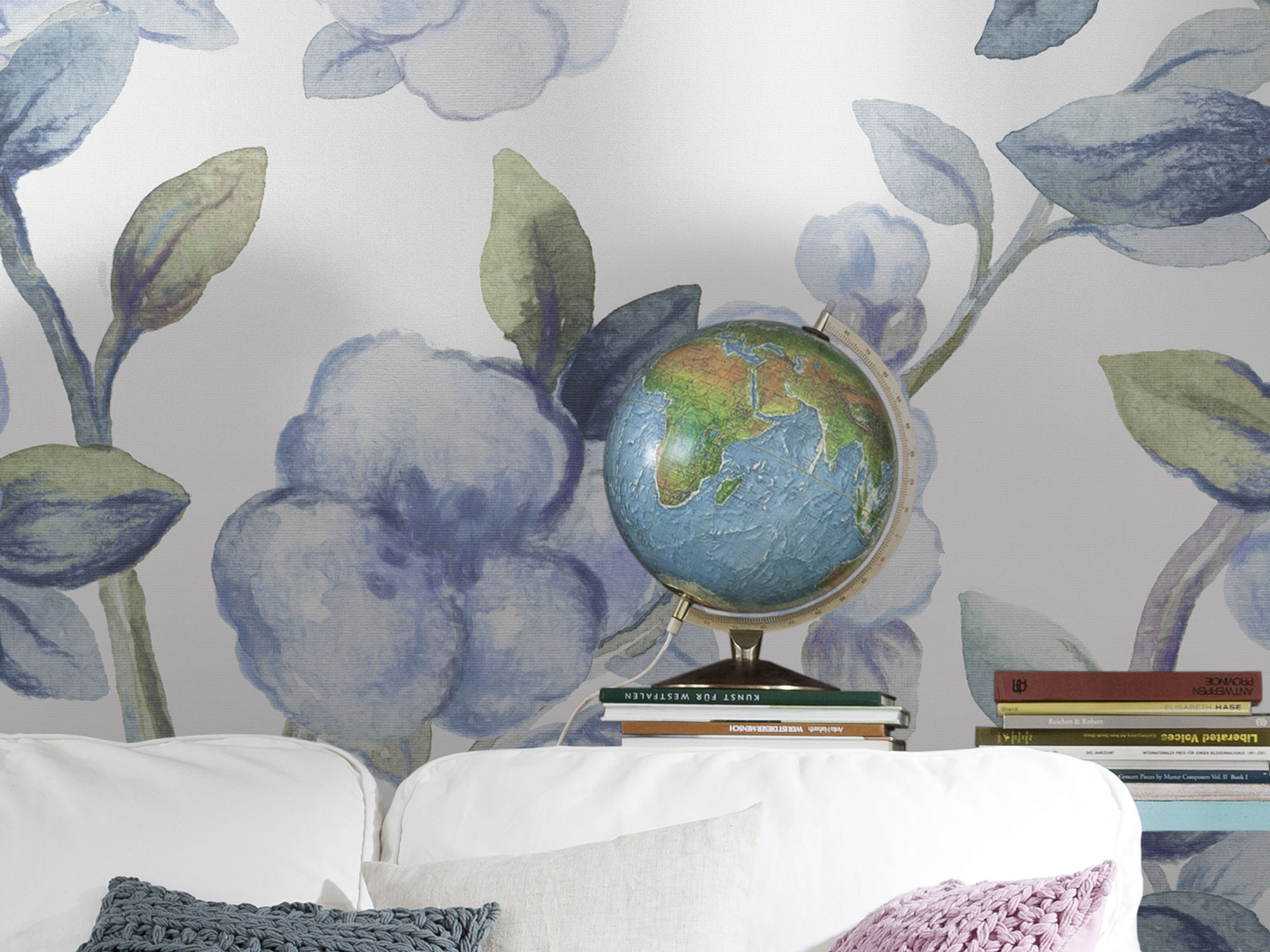 The blue flowering vine on this photomural is truly a work of art. Very delicately, just like a watercolour painting, it extends across the photomural, adorning white walls to the delight of its observers.