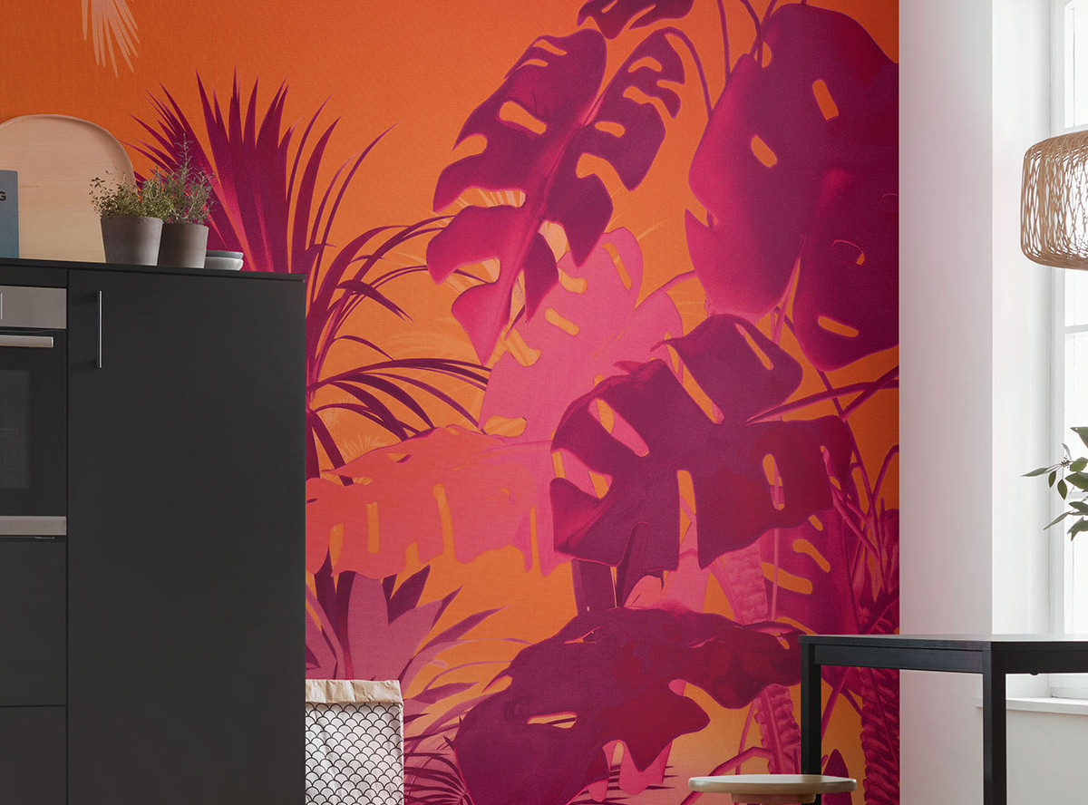 This extravagant wallpaper design combines a bright orange background with striking pink plants in the foreground and is the perfect choice for anyone who likes to set bold accents. The bold pattern guarantees that your home will never look boring and is guaranteed to attract attention - ideal for lovers of expressive interiors.