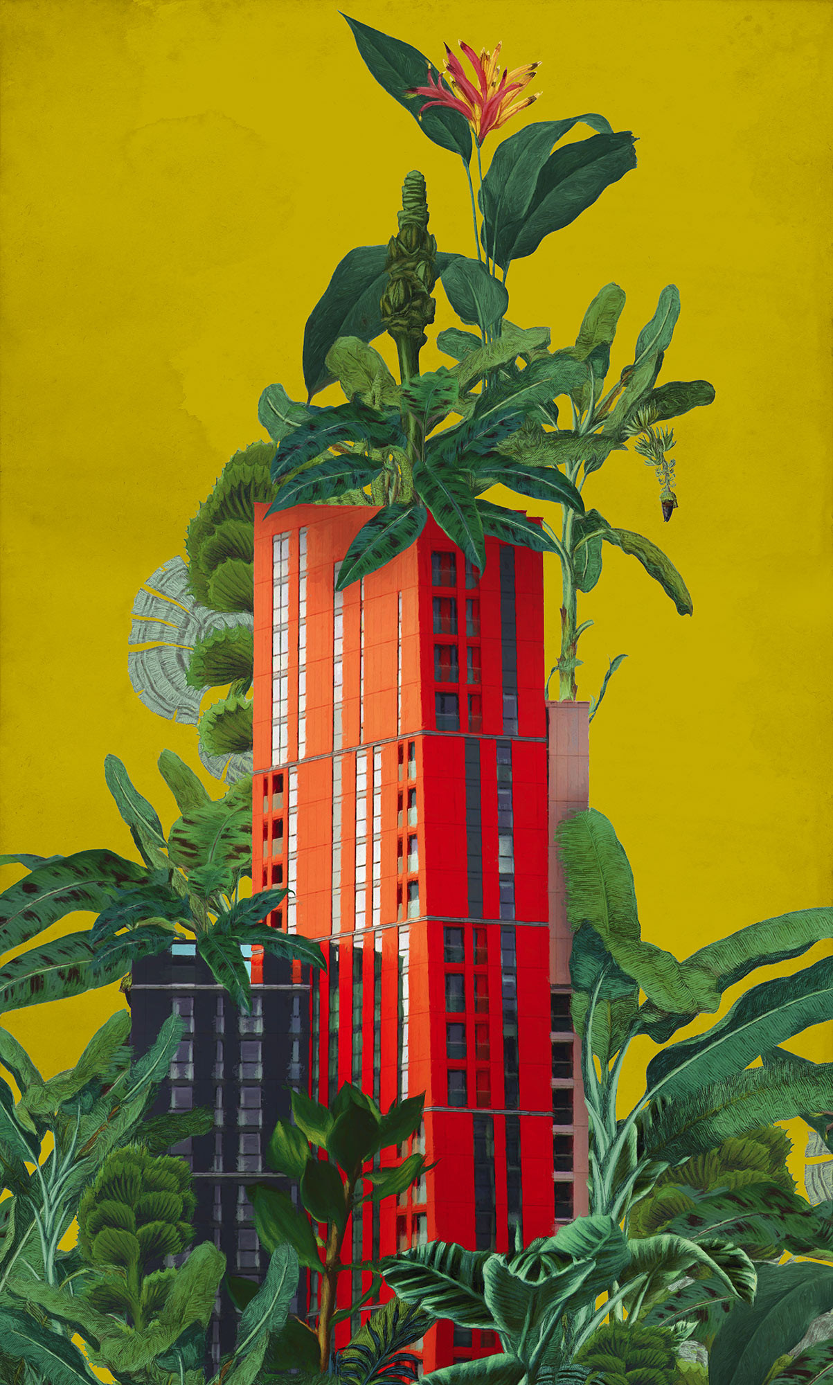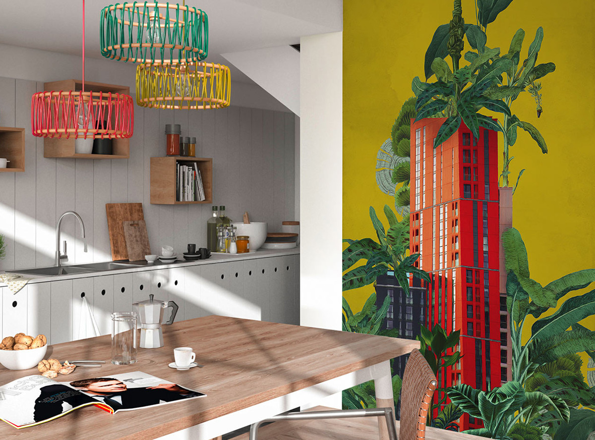The vibrant red of the tower block forms an impressive contrast to the lush green of the surrounding vegetation. The yellow background enhances the lively and inviting flair of this scene and creates a unique backdrop that brings a piece of nature and urbanity into the home.