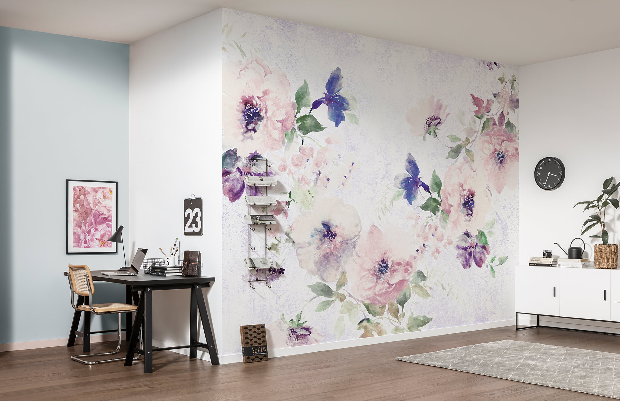 It’s almost like a huge bouquet of flowers for your wall. The blossoms in a delicate shade of purple create a calming atmosphere and spread pure romance in the room.