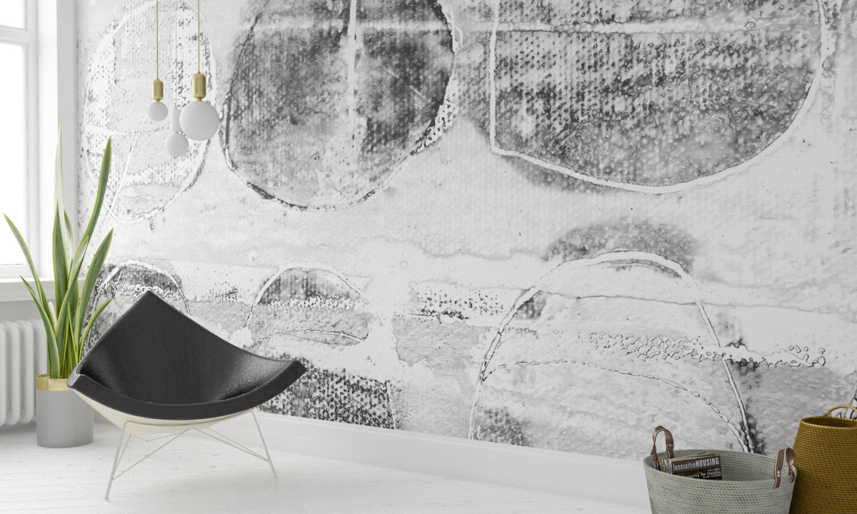 Rolls Rolling: Runde Formen bewegen sich auf malerischen Flächen in weiss, grau.