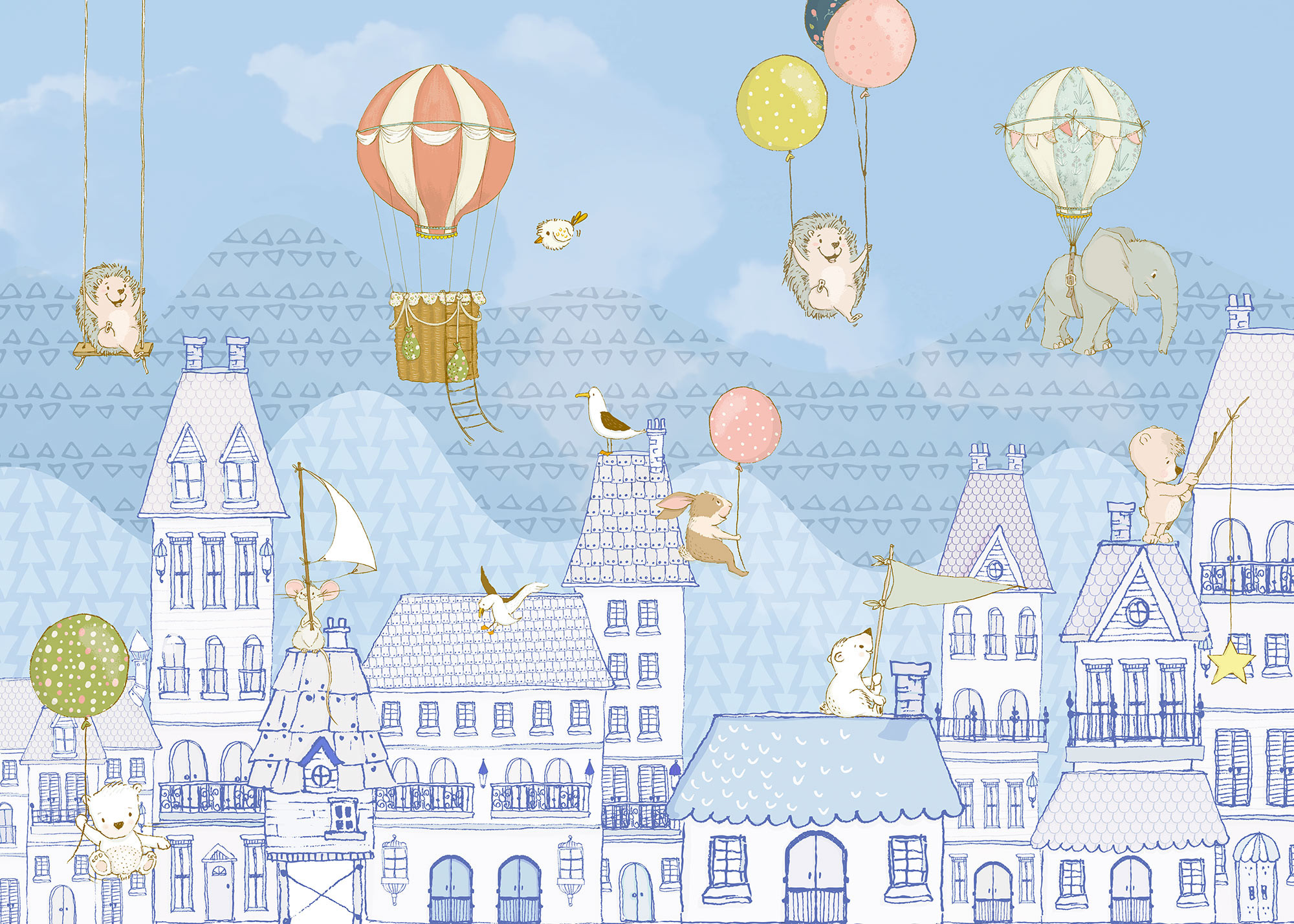 Take it easy! These cute animals fly cheerfully and light as a feather on the colourful balloons over this wallpaper.