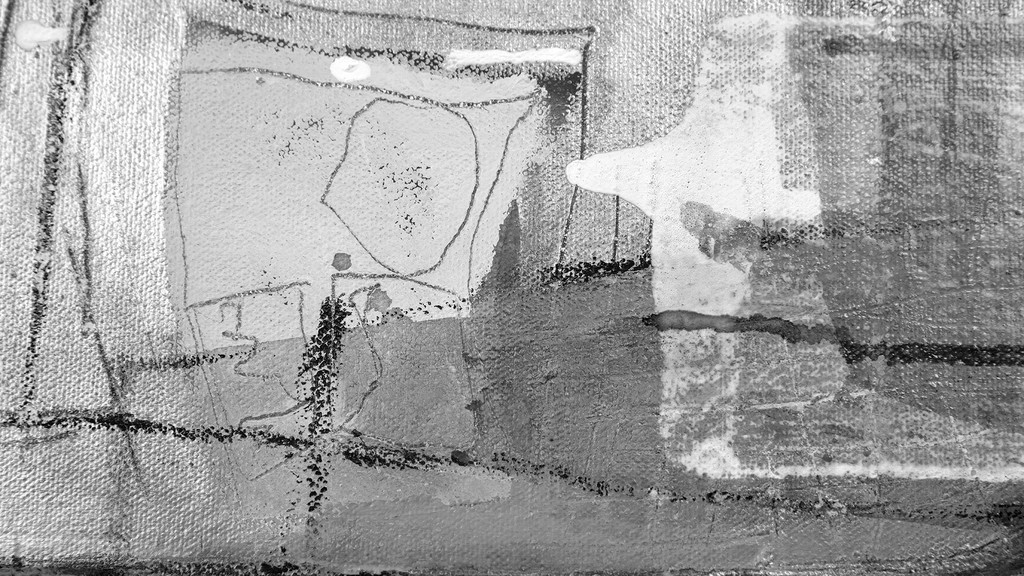 Rooms Opening: Rautenförmig-transparent schwebt ein wolkiges Gebilde durch den malerischen Farbraum in grau, weiss.