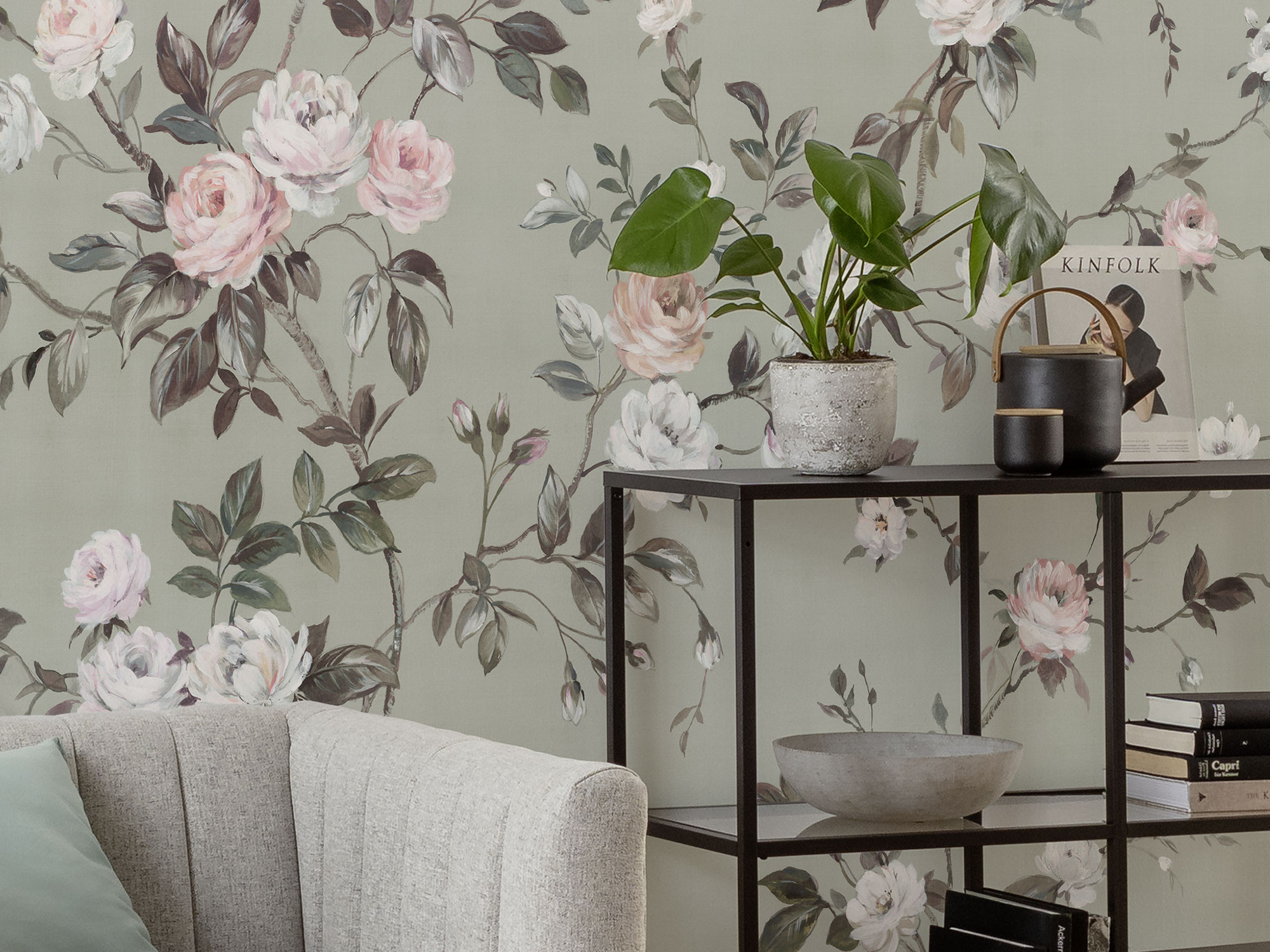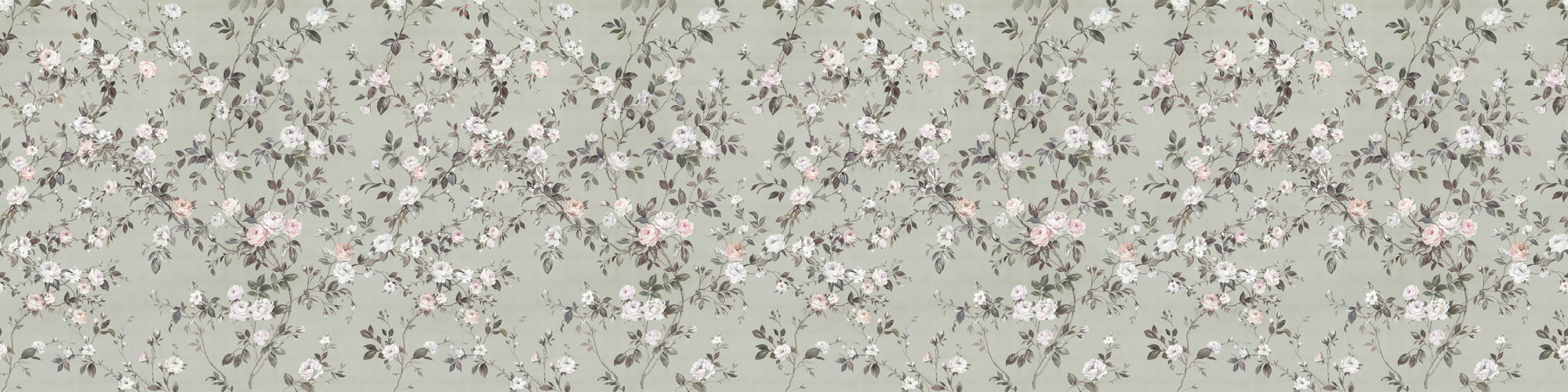 Pinkish-white blossoms adorn this vintage-style photomural. The tendrils are generously distributed across the trendy mint green background. This floral mural is the perfect decorative highlight for lovers of pastel colours and those who dream of having a rose garden right in their own home.
