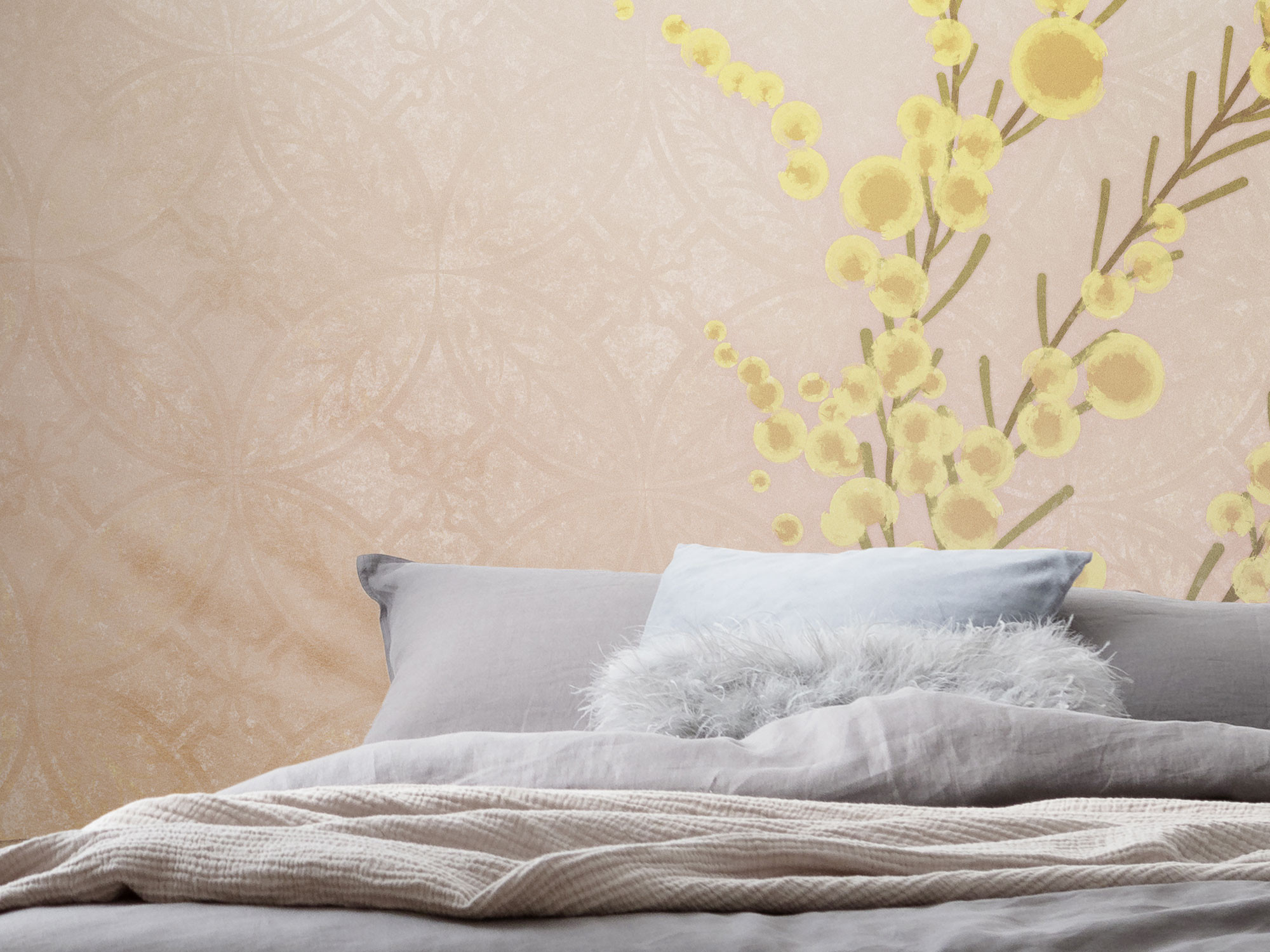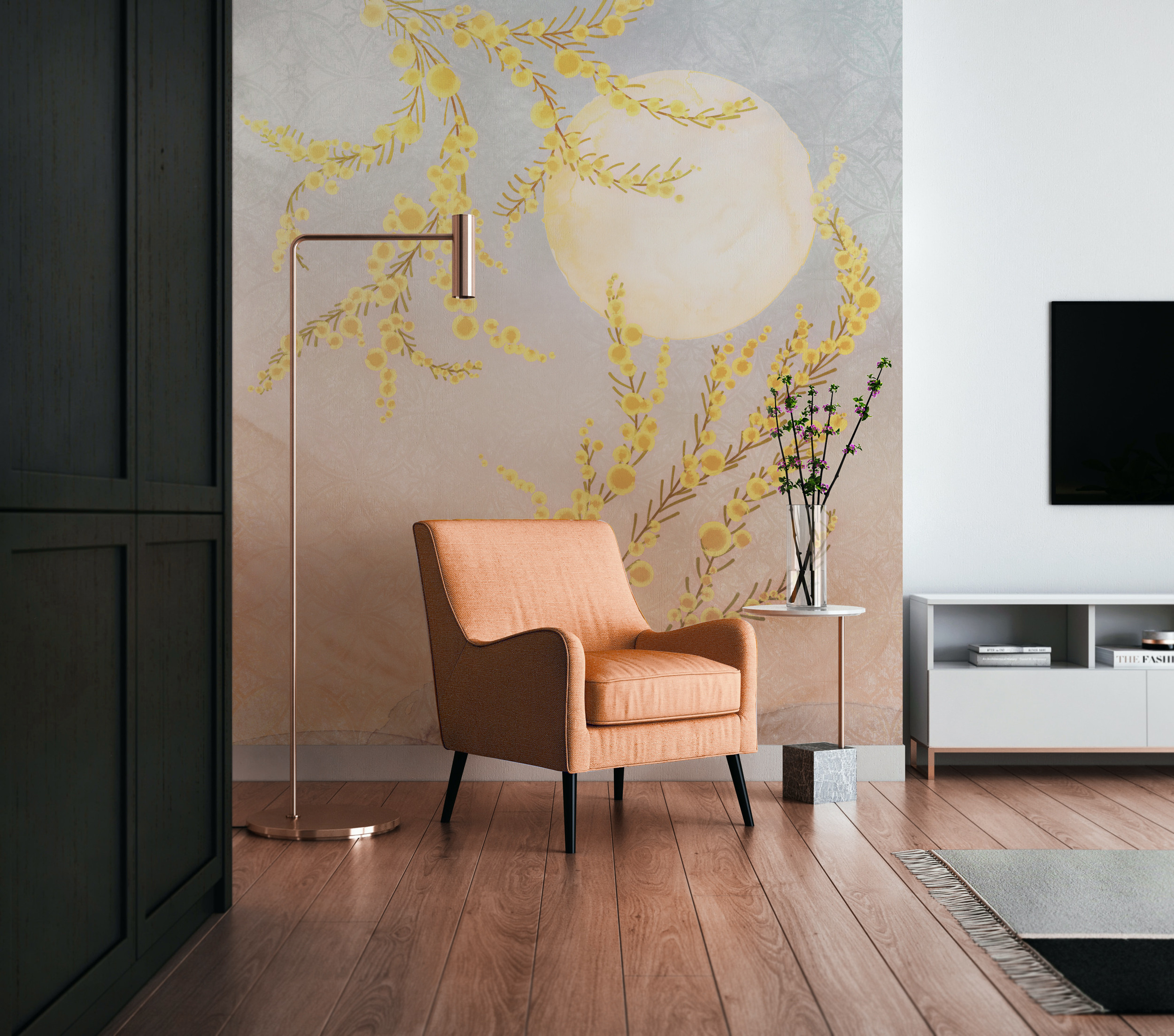The greenery stands out and appears to dance in the wind. The mural warms up the home with its flowing transitions and pastel shades and adds an oriental touch.