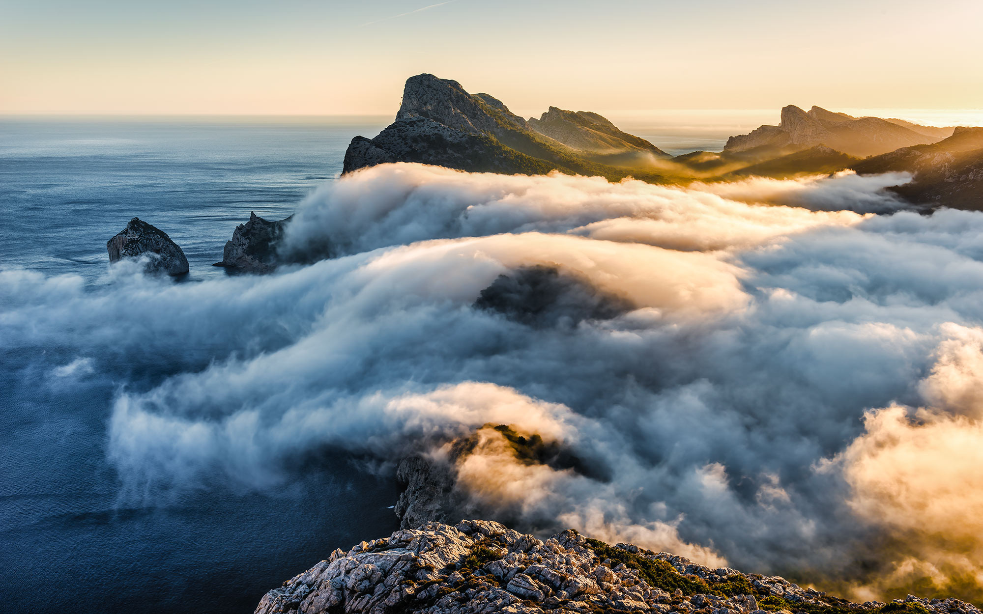 Hidden behind the clouds - the Mallorcan coastline in the early morning hours.