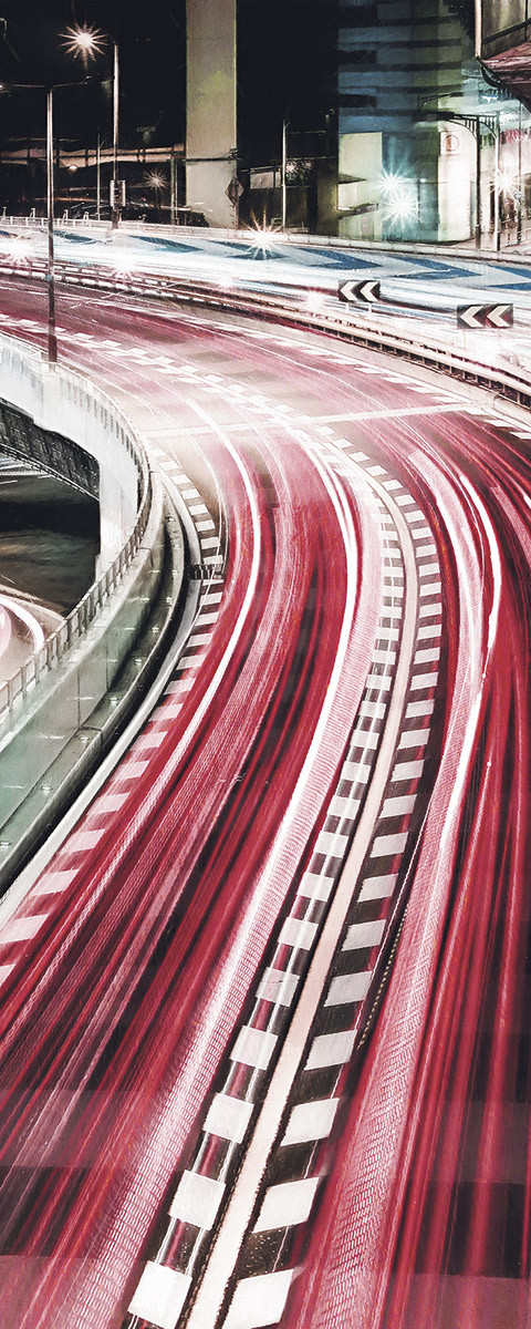 Feel the speed! Fine brushstrokes create an urban sea of lights.