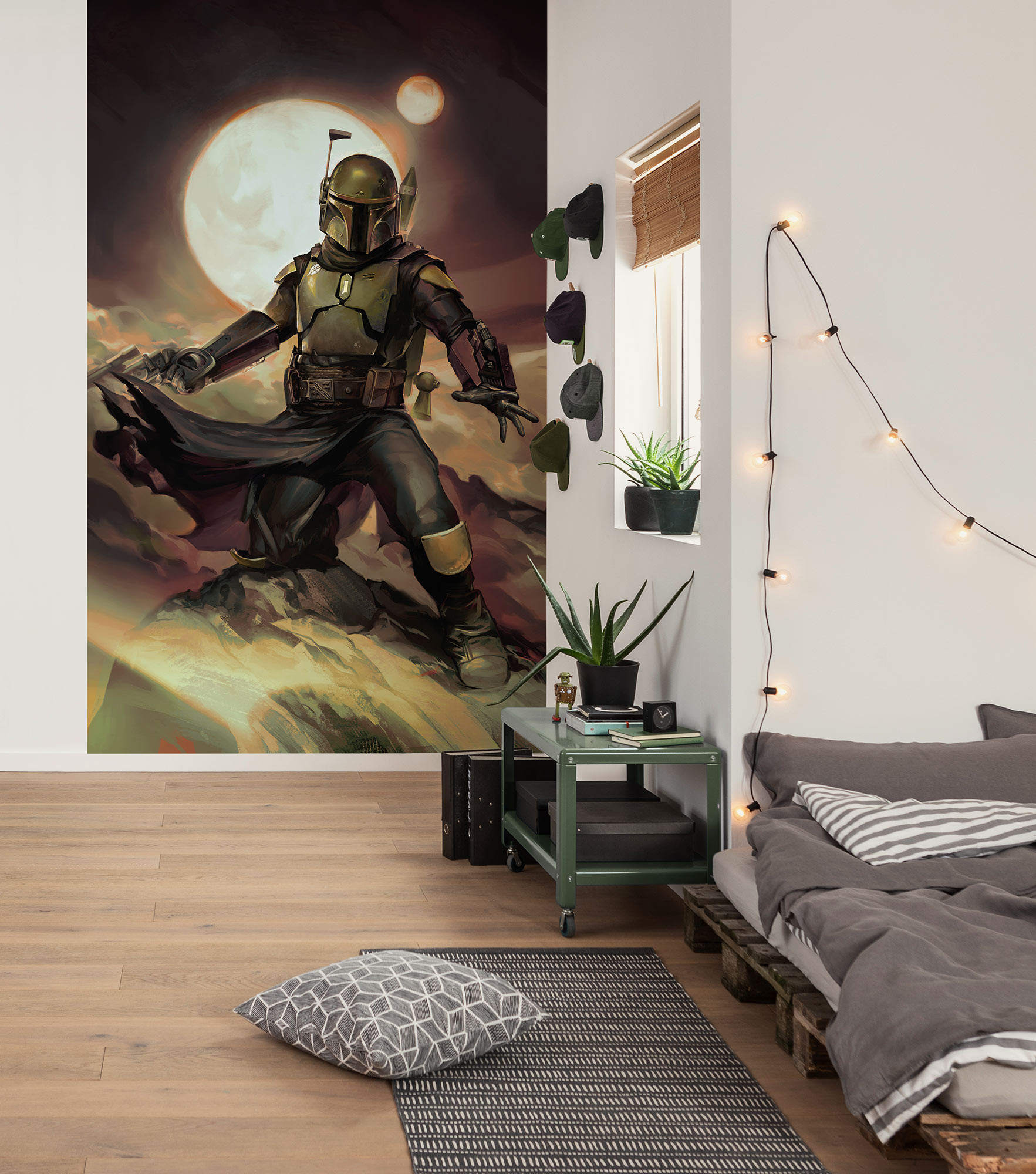 What an impressive setting! The wallpaper shows Boba Fett in large format as he confronts his opponent in a desert-like setting, ready for battle. The colour palette of warm earth tones and cool light accents creates a unique atmosphere that transforms the room into an atmospheric yet powerful environment. An absolute highlight for Star Wars fans and lovers of impressive designs!
