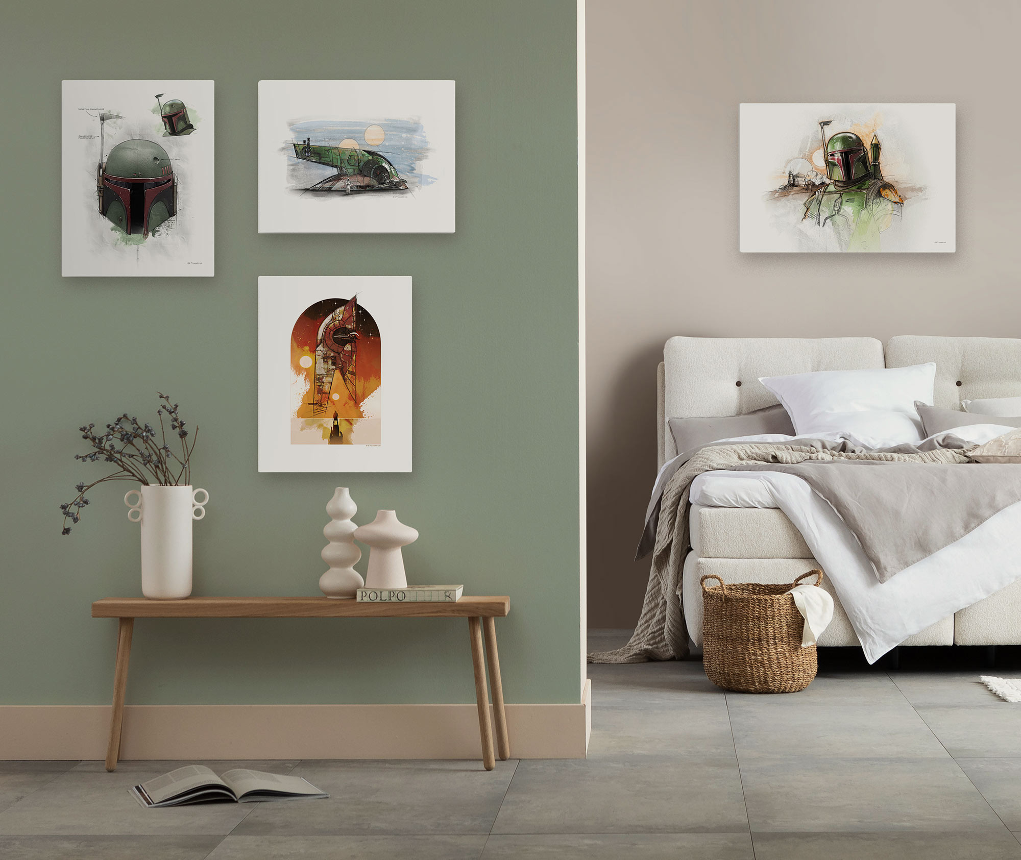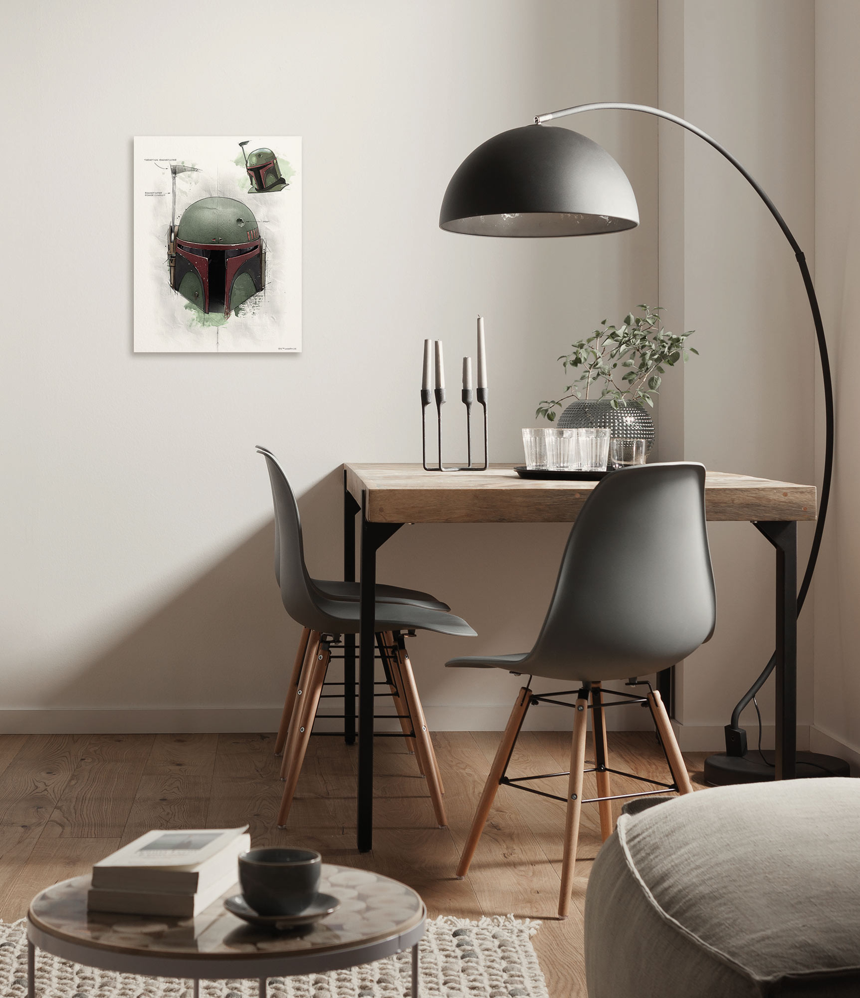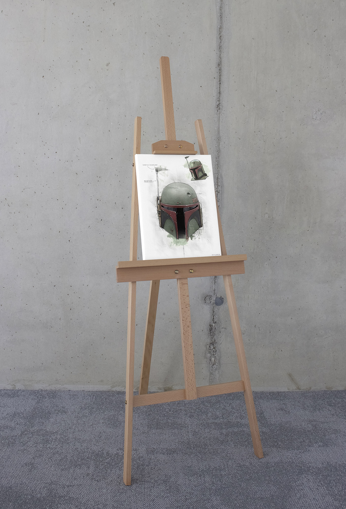 The mural features a stylized sketch of Boba Fett's iconic helmet from the Star Wars universe. The helmet is depicted with detailed lines and a watercolor-like color scheme that emphasizes his character as a bounty hunter. A smaller, side view of the helmet is included at the top to complement the design and enhance the technical feel.