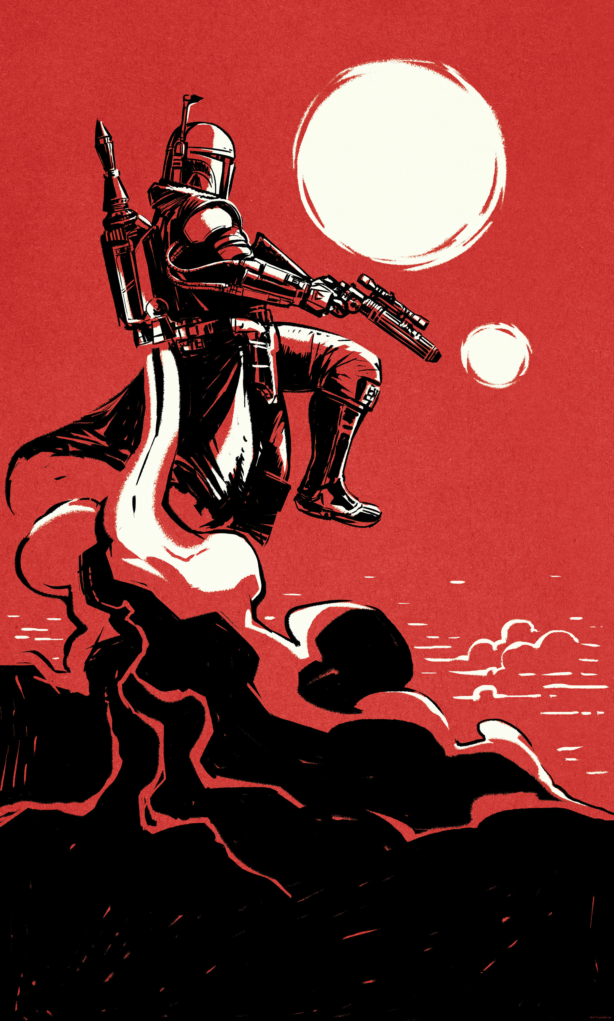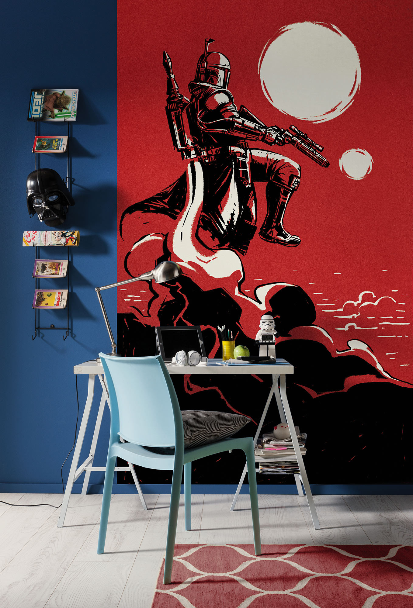 This photomural is not only a must-have for fans of the legendary Star Wars saga, but also for lovers of retro designs. The minimalist photo wallpaper shows the striking profile of the bounty hunter Boba Fett against a red and black background and serves as a stylish homage to his mysterious and unwavering personality.
