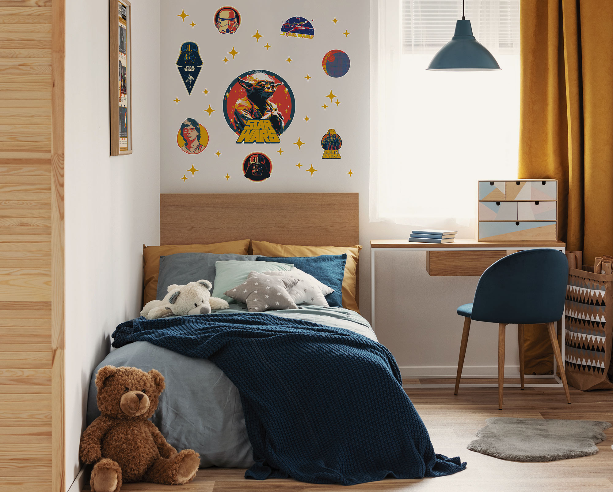 The image shows retro-inspired Star Wars illustrations: Yoda at the centre, surrounded by Luke Skywalker, Darth Vader, stormtroopers, bounty hunters, spaceships and golden stars.