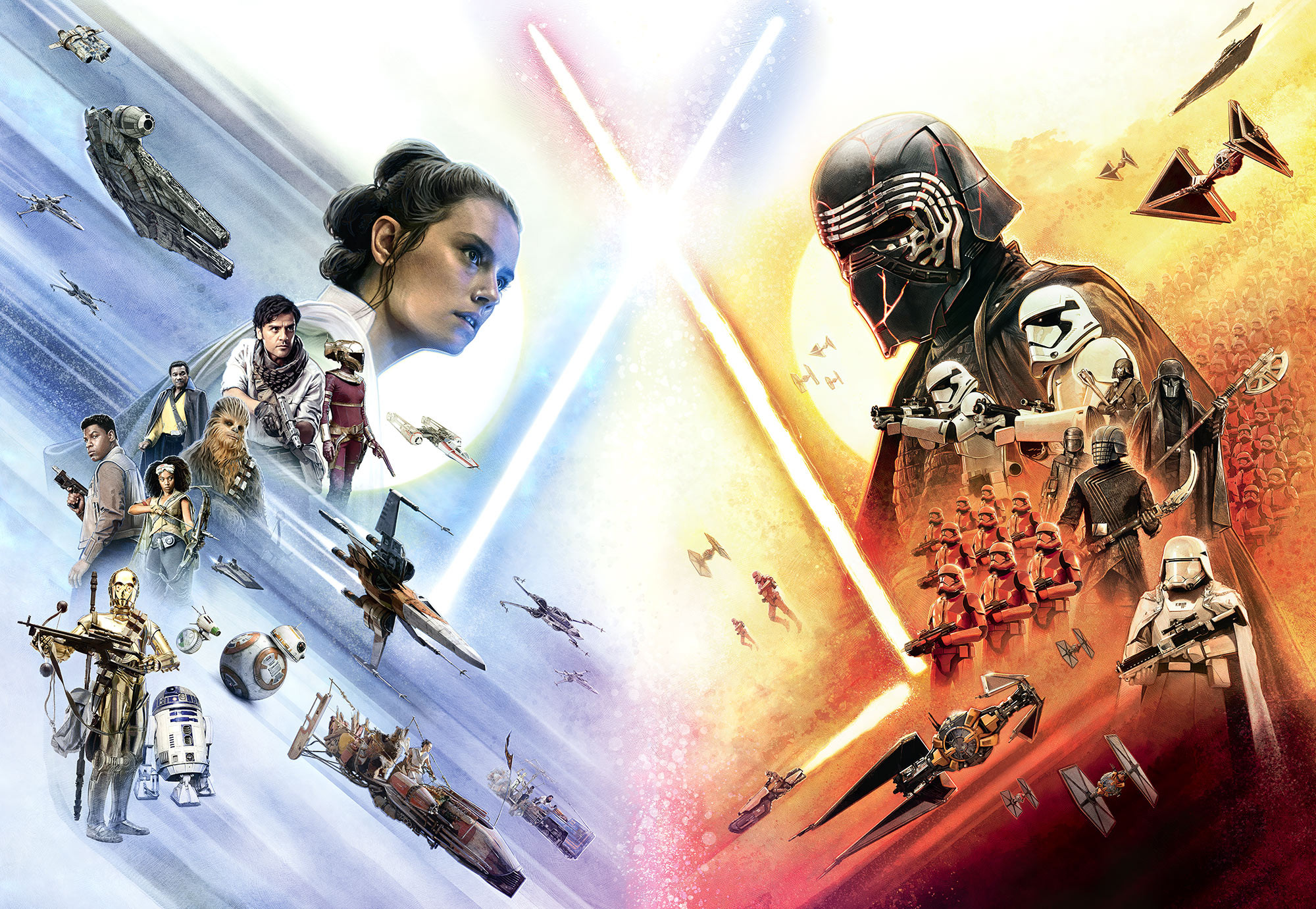 Rey vs. Kylo Ren. The crossed lightsabers reflect the intergalactic battle between good and evil, morality and immorality. The Rebel Alliance faces the Empire's armed forces.