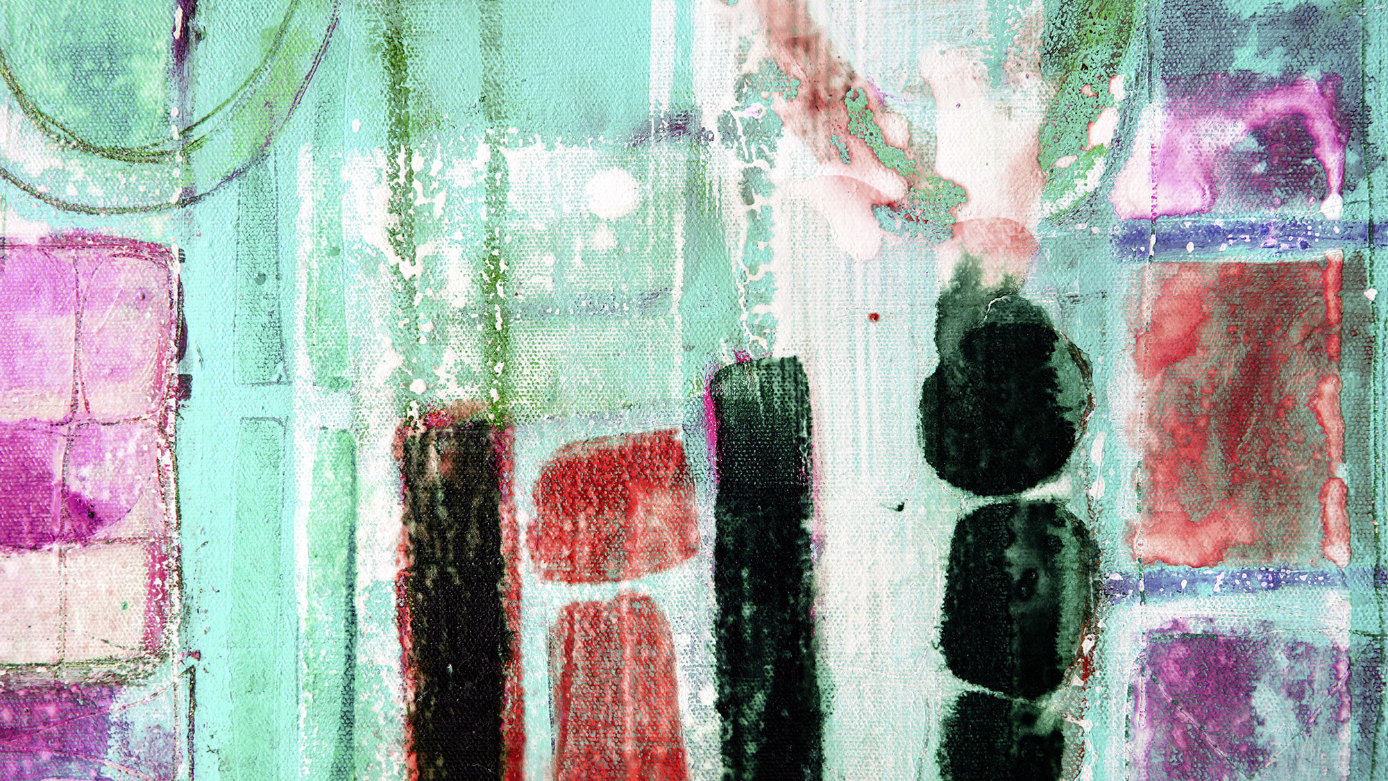 Stems Blooming: Ein magischer Wald als imaginäres Reich aus Rechtecken und Kreisen, Linien und Flächen in grün, türkis.