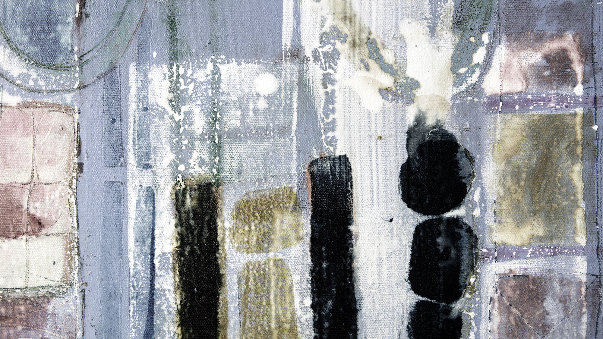 Stems Blooming: Ein magischer Wald als imaginäres Reich aus Rechtecken und Kreisen, Linien und Flächen ingrau, beige.