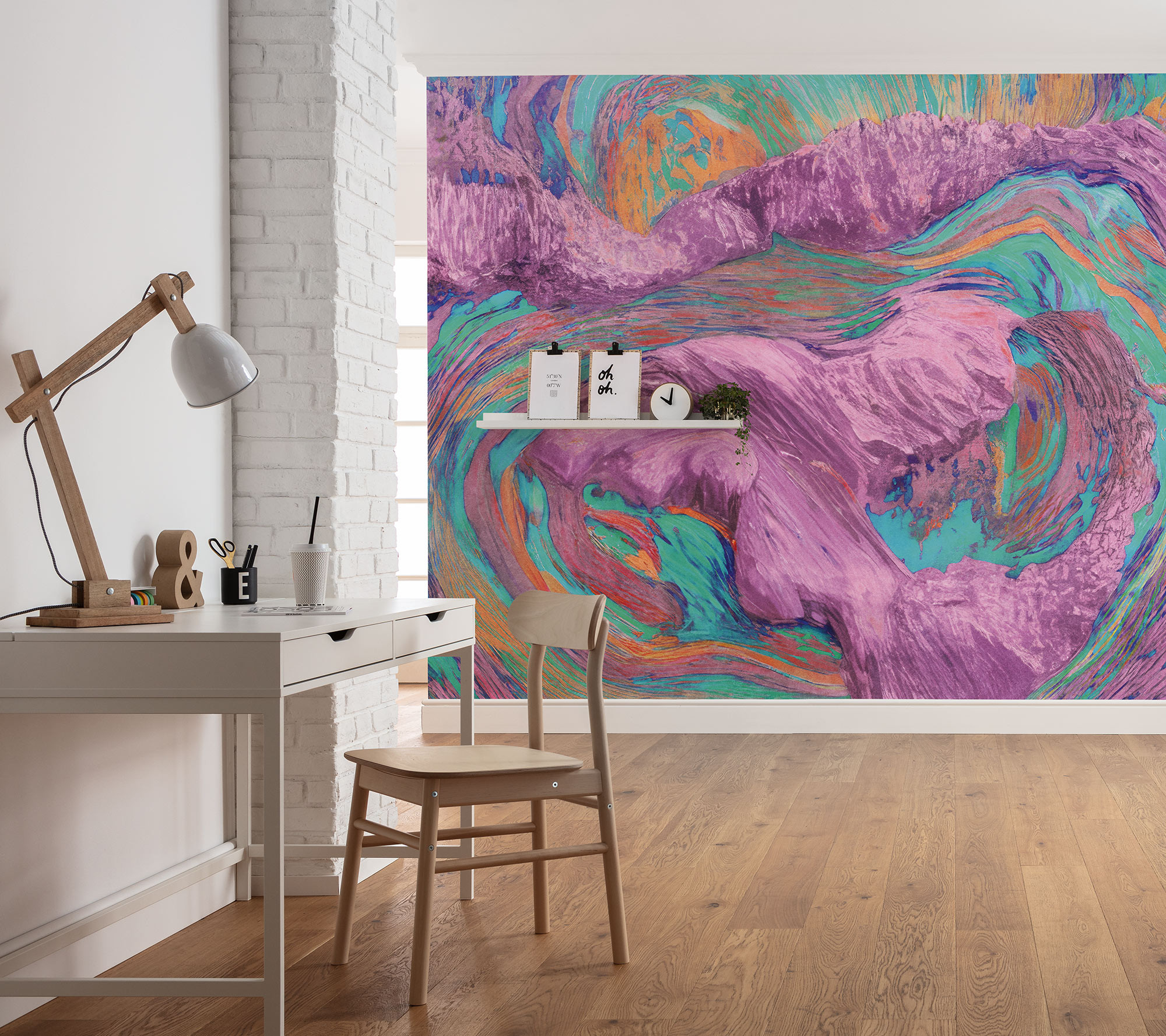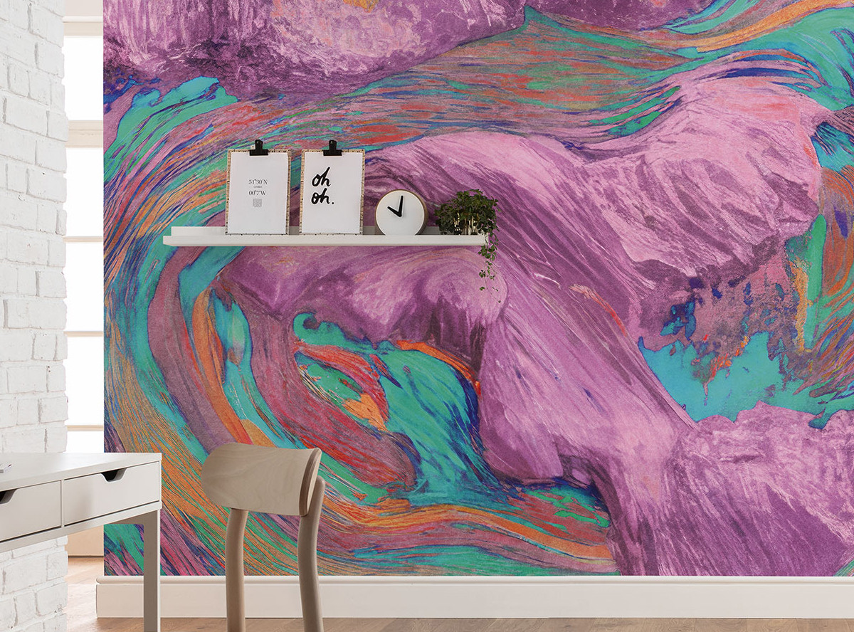 An abstract photomural whose mixture of colours in pink and turquoise is reminiscent of a whirlwind. This vibrant combination creates an energetic and dynamic atmosphere that adds an artistic and modern touch to any room.