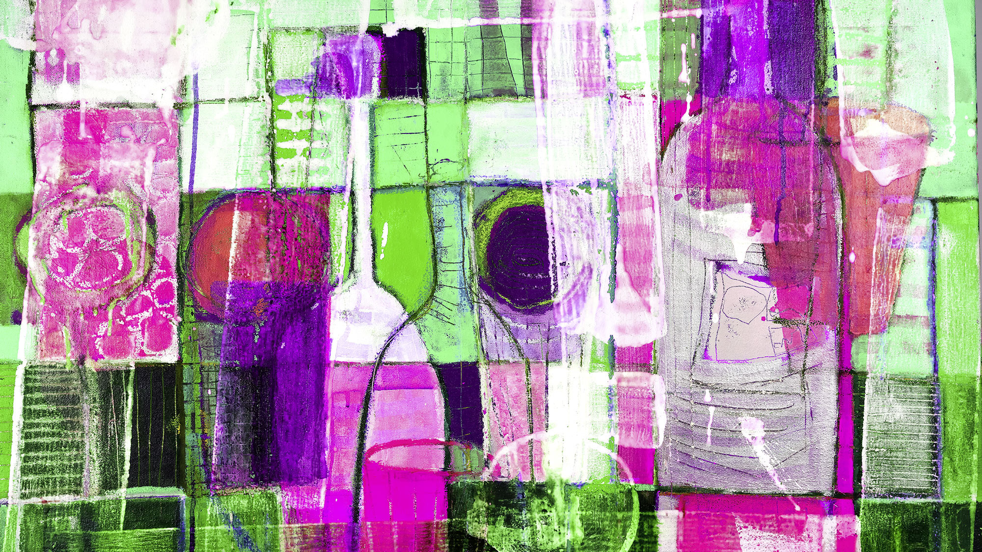 Tableau Living: Leuchtende Gläser und Flaschen fügen sich zu einem kubistisch-malerischen Stillleben in grün, pink.