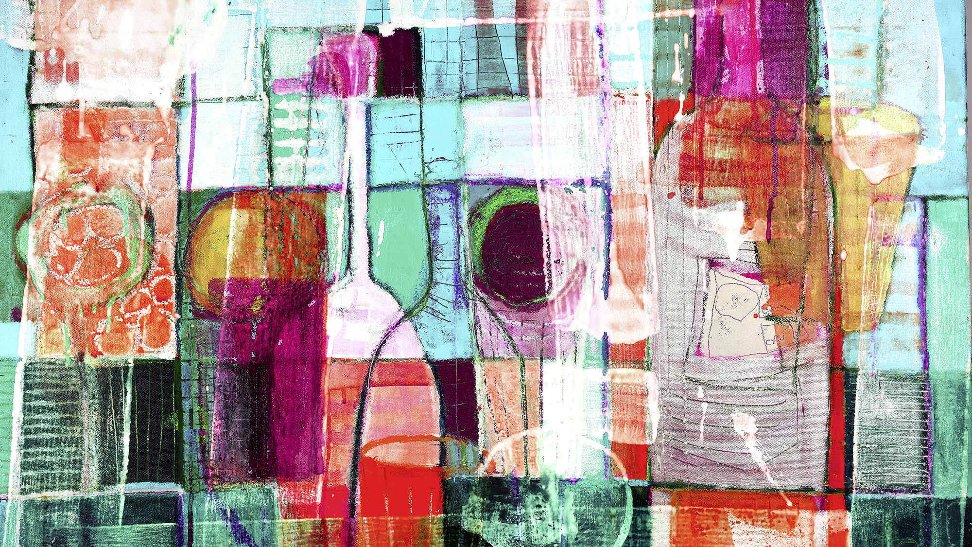 Tableau Living: Leuchtende Gläser und Flaschen fügen sich zu einem kubistisch-malerischen Stillleben in grün, rot.