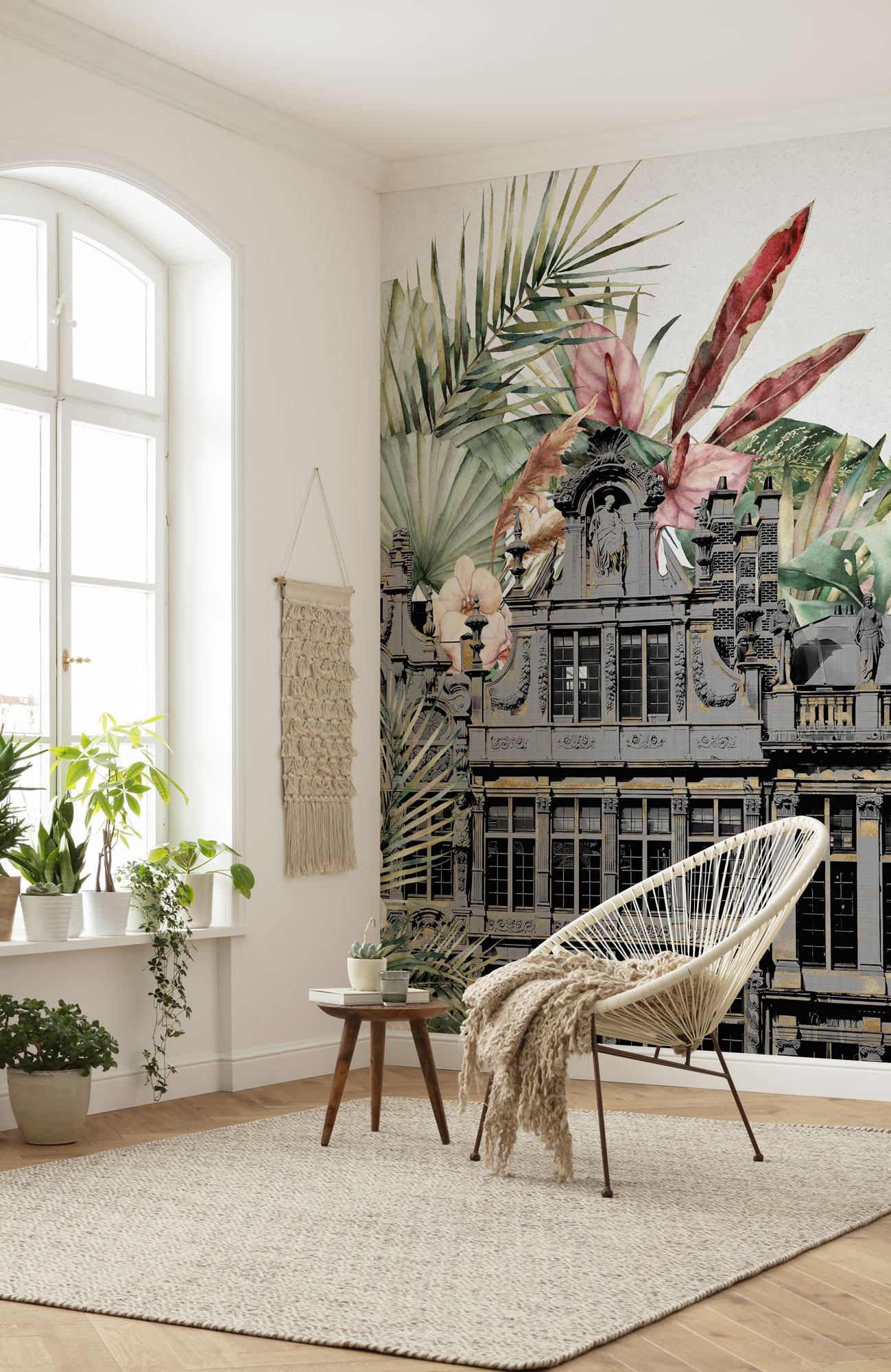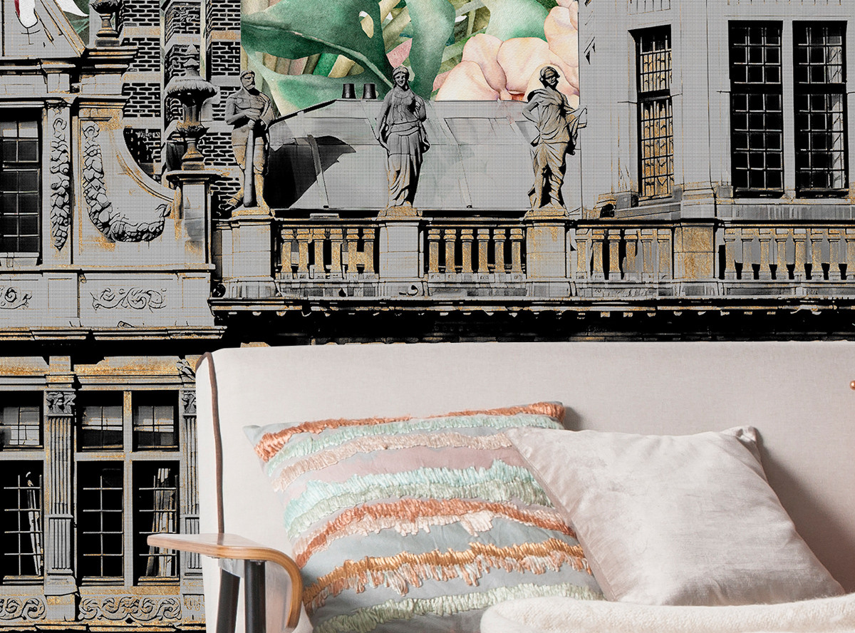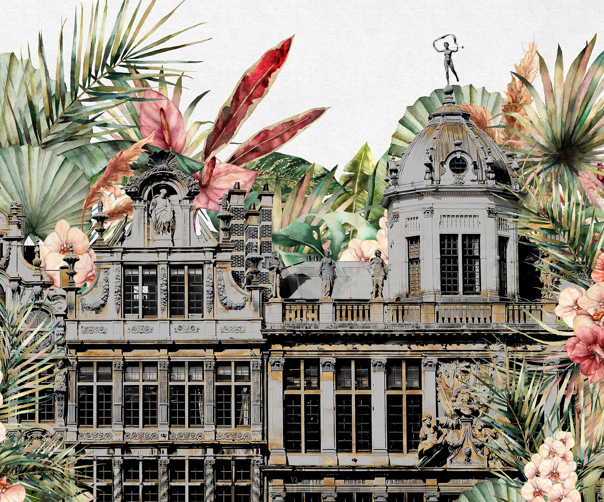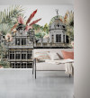 The tropical palace, surrounded by flowers and tropical plants, presents an extravagant and detailed work of art for the wall. The royal floral paradise gives the room pure elegance and an unusual look.