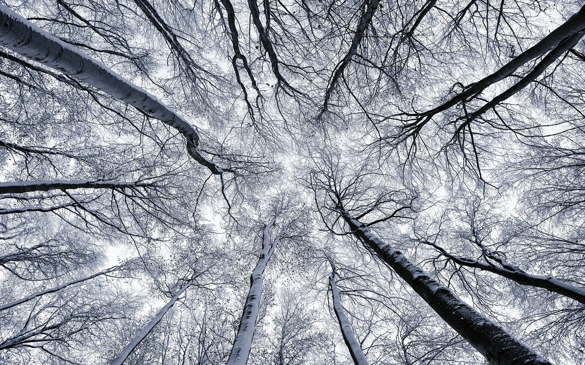 You only need to change your perspective sometimes – this upward view reveals the whole beauty of a winter forest.