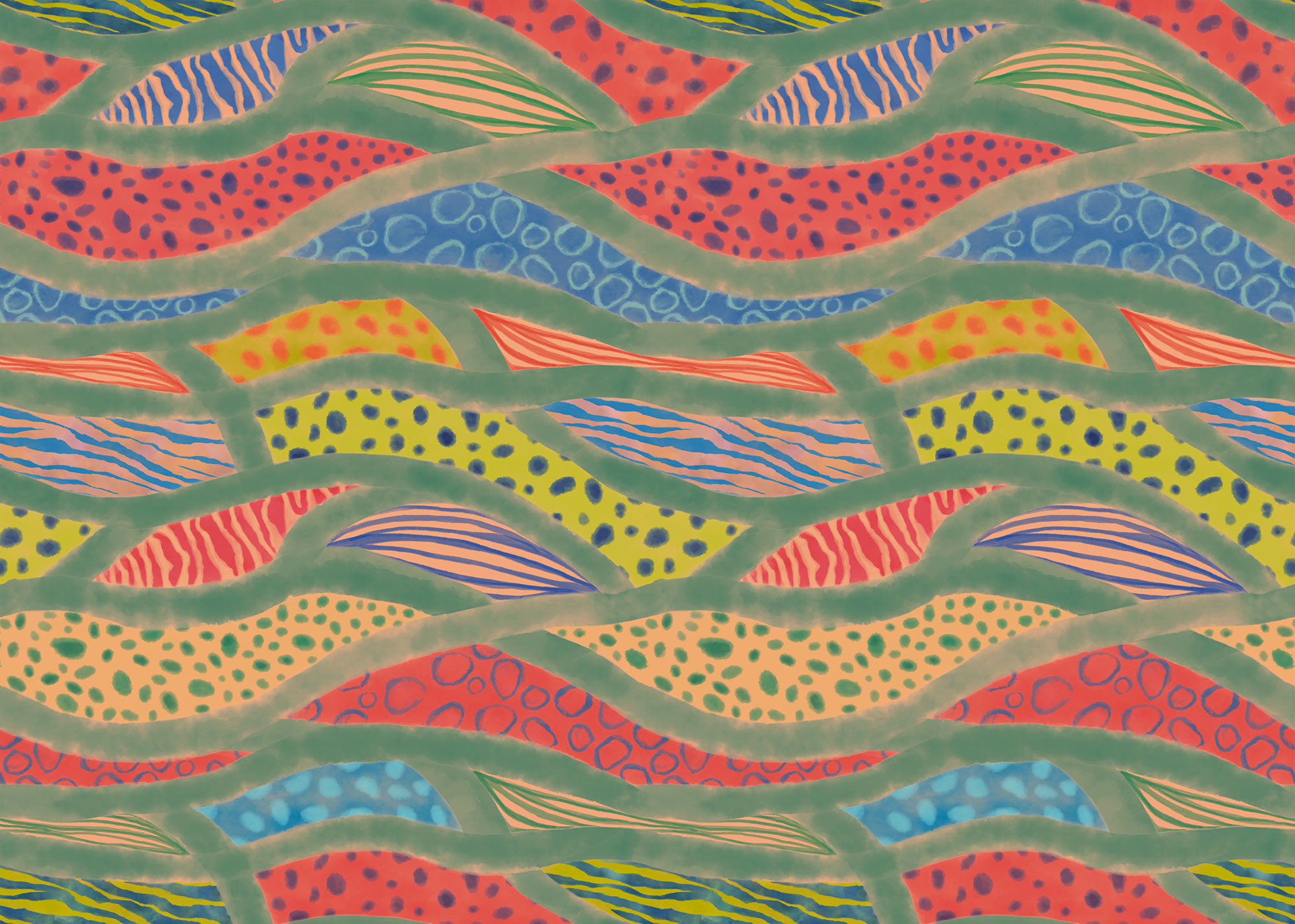 This photomural transforms any wall into a masterful work of art with undulating patterns that elegantly stretch across the surface. The harmonious combination of different patterns and vibrant colours creates a dynamic backdrop that adds a fascinating depth and gallery quality to any room.