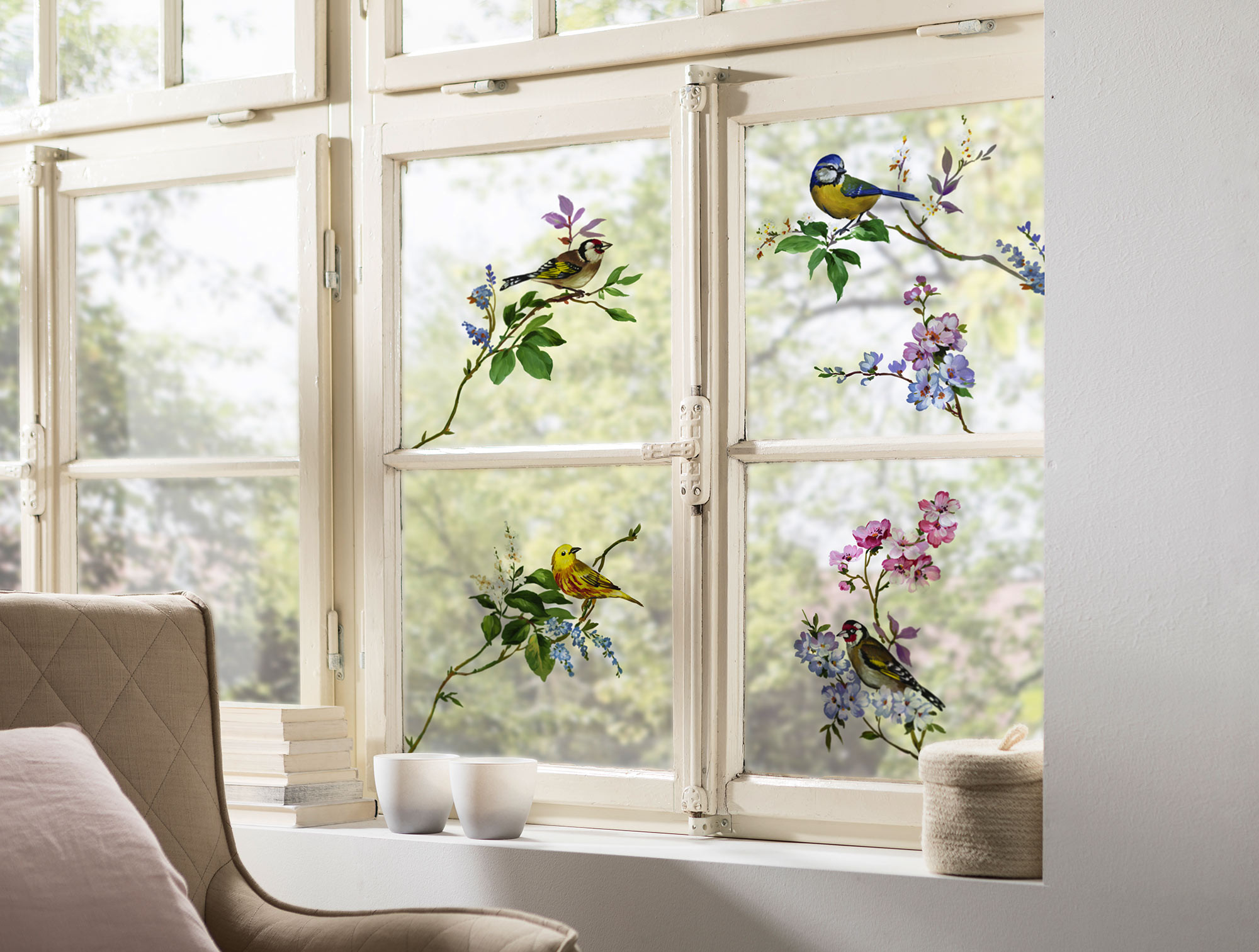 The trendy window stickers sweeten the view outside and enchant the home into a cute bird paradise. Delicate blossom branches underline the romantic spring-like look.